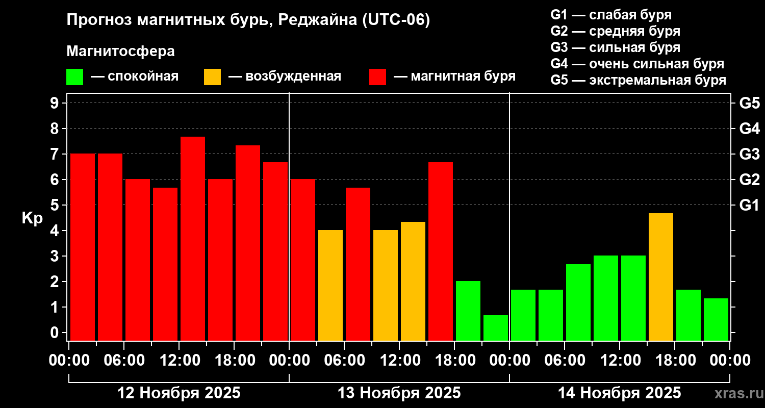 Прогноз магнитных бурь в Реджайне — 12 ноября 2025 года