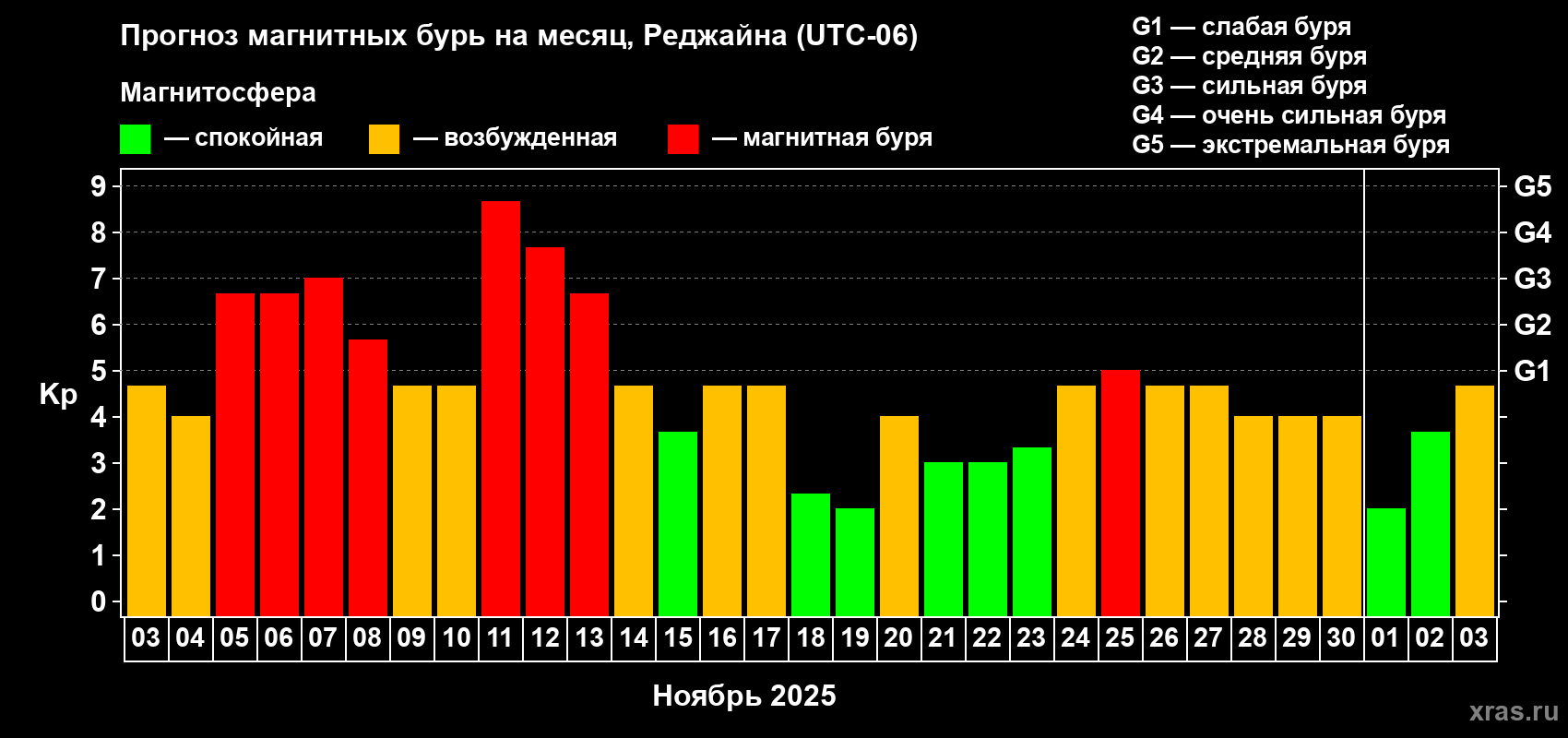 Прогноз магнитных бурь в Реджайне — 3 ноября 2025 года
