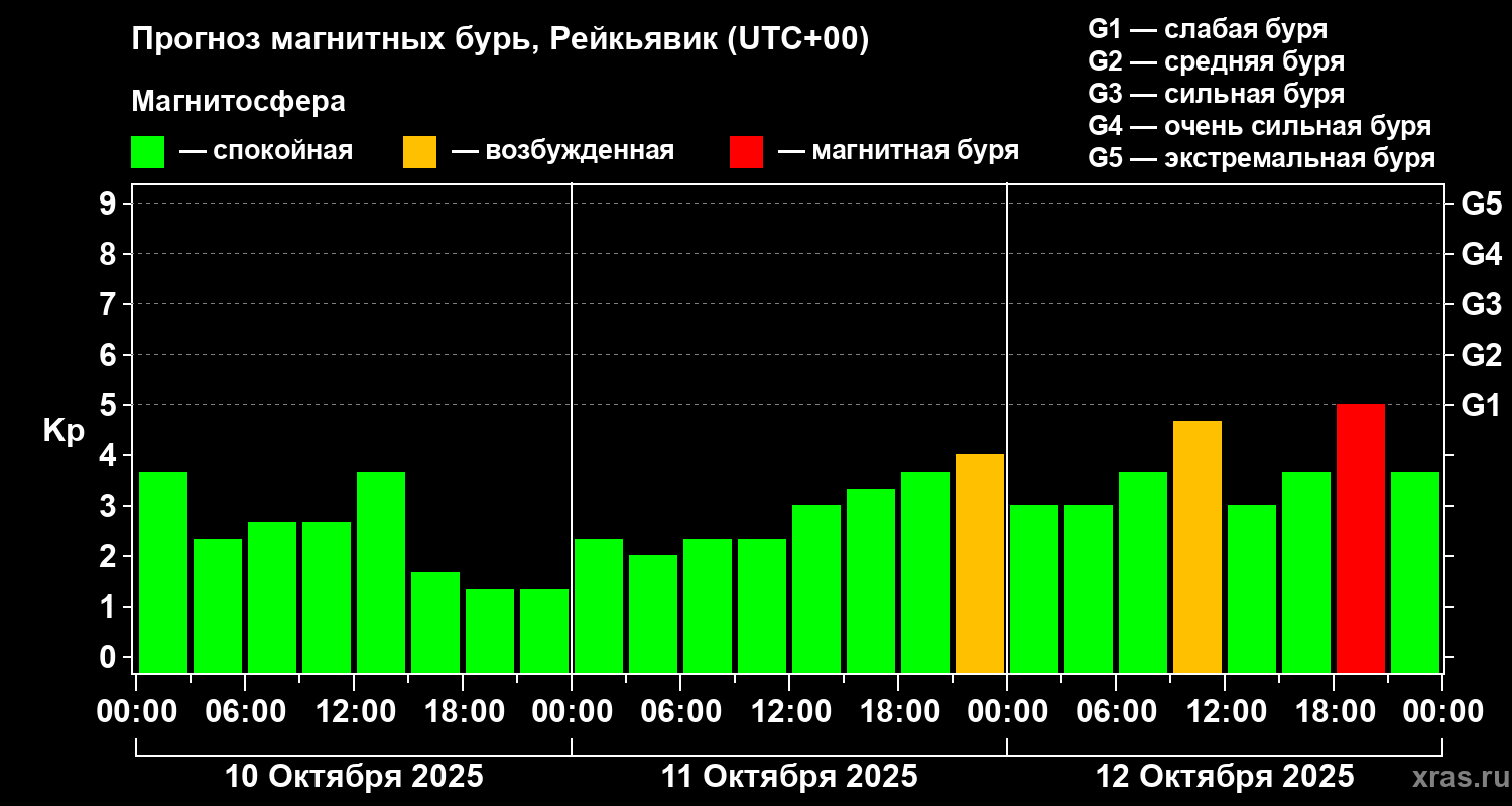 Прогноз магнитных бурь в Рейкьявике — 10 октября 2025 года