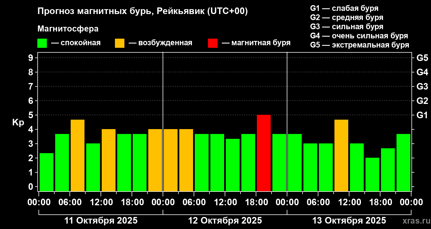 Прогноз магнитных бурь в Рейкьявике — 11 октября 2025 года