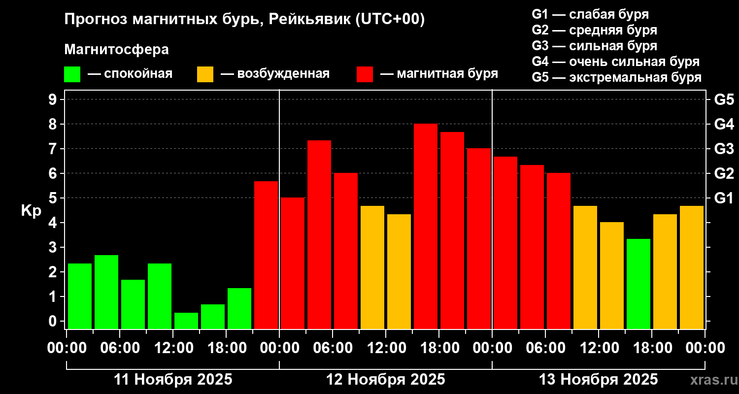 Прогноз магнитных бурь в Рейкьявике на 11 ноября 2025 года