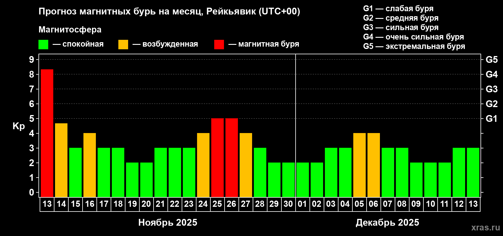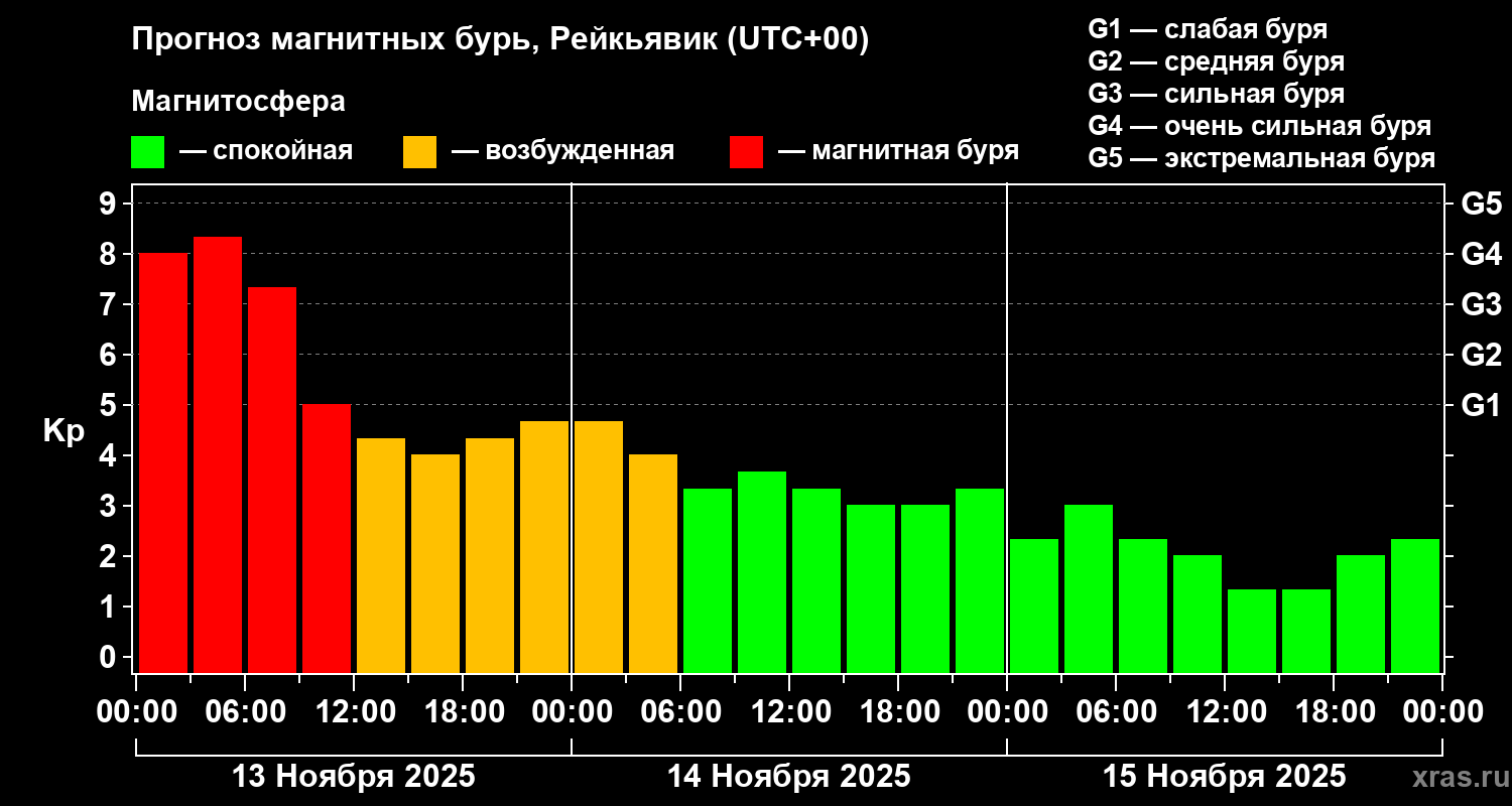 Прогноз магнитных бурь в Рейкьявике на 13 ноября 2025 года