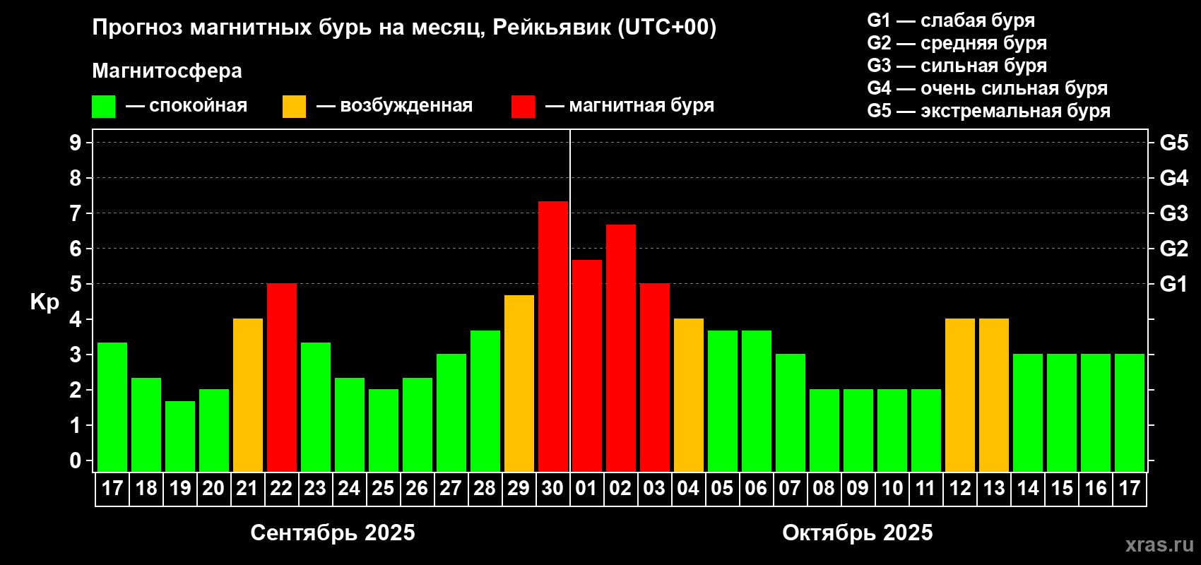 Прогноз магнитных бурь в Рейкьявике на 17 сентября 2025 года