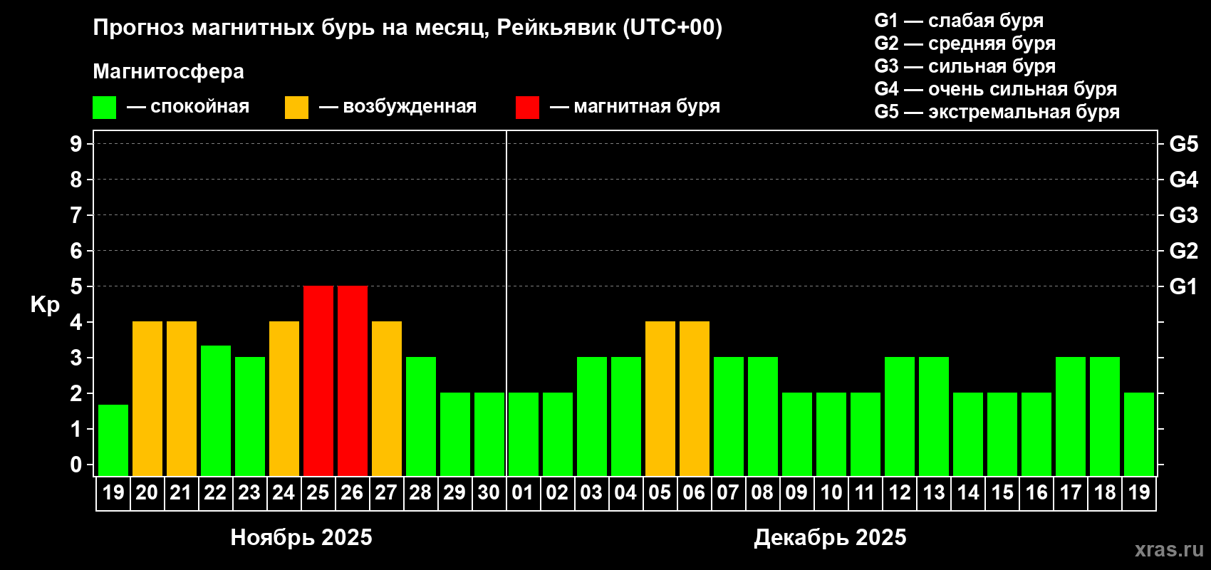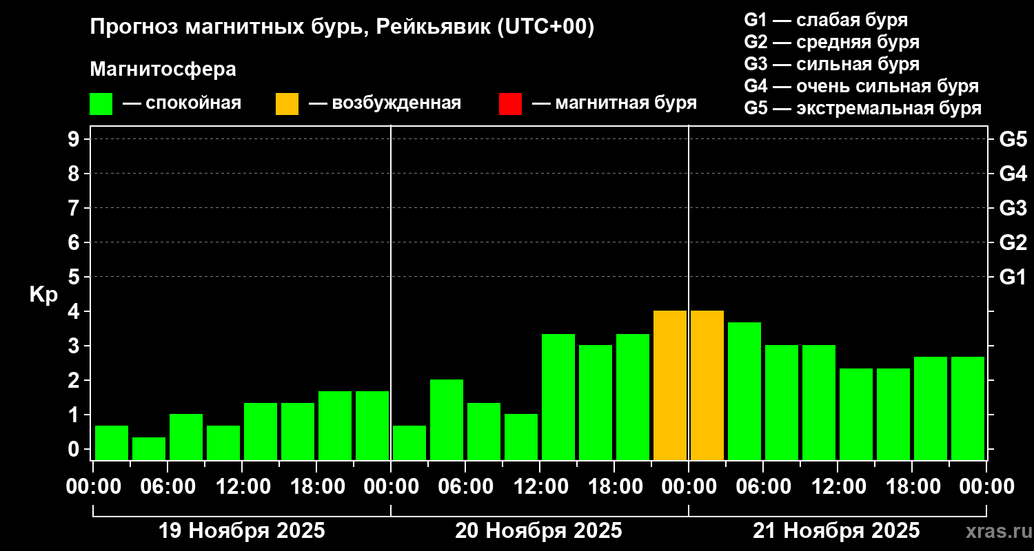 Прогноз магнитных бурь в Рейкьявике на 19 ноября 2025 года