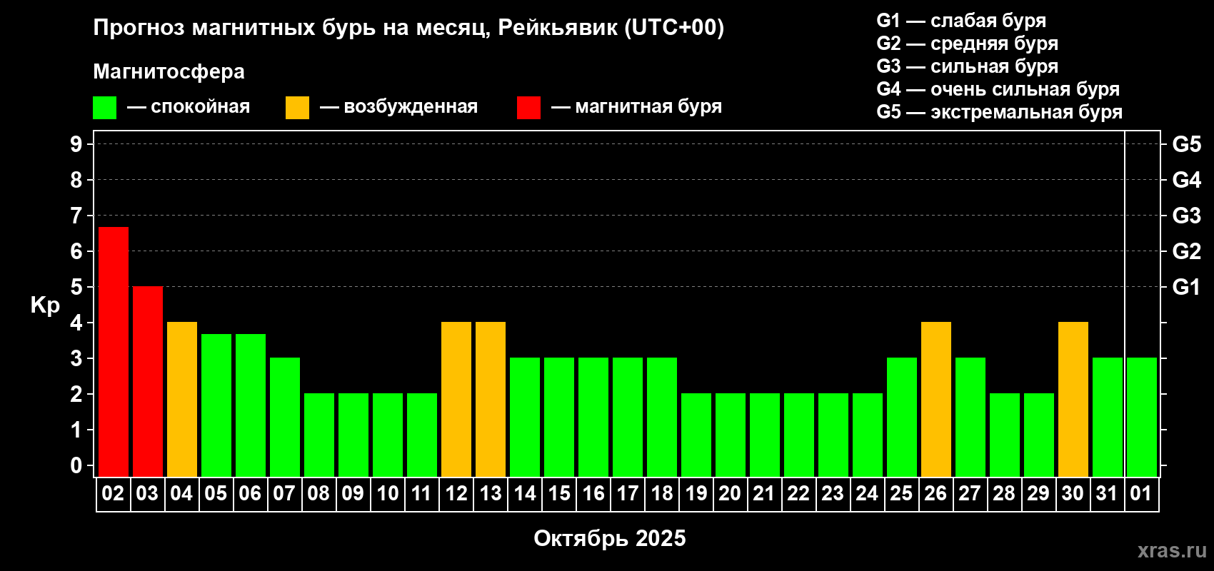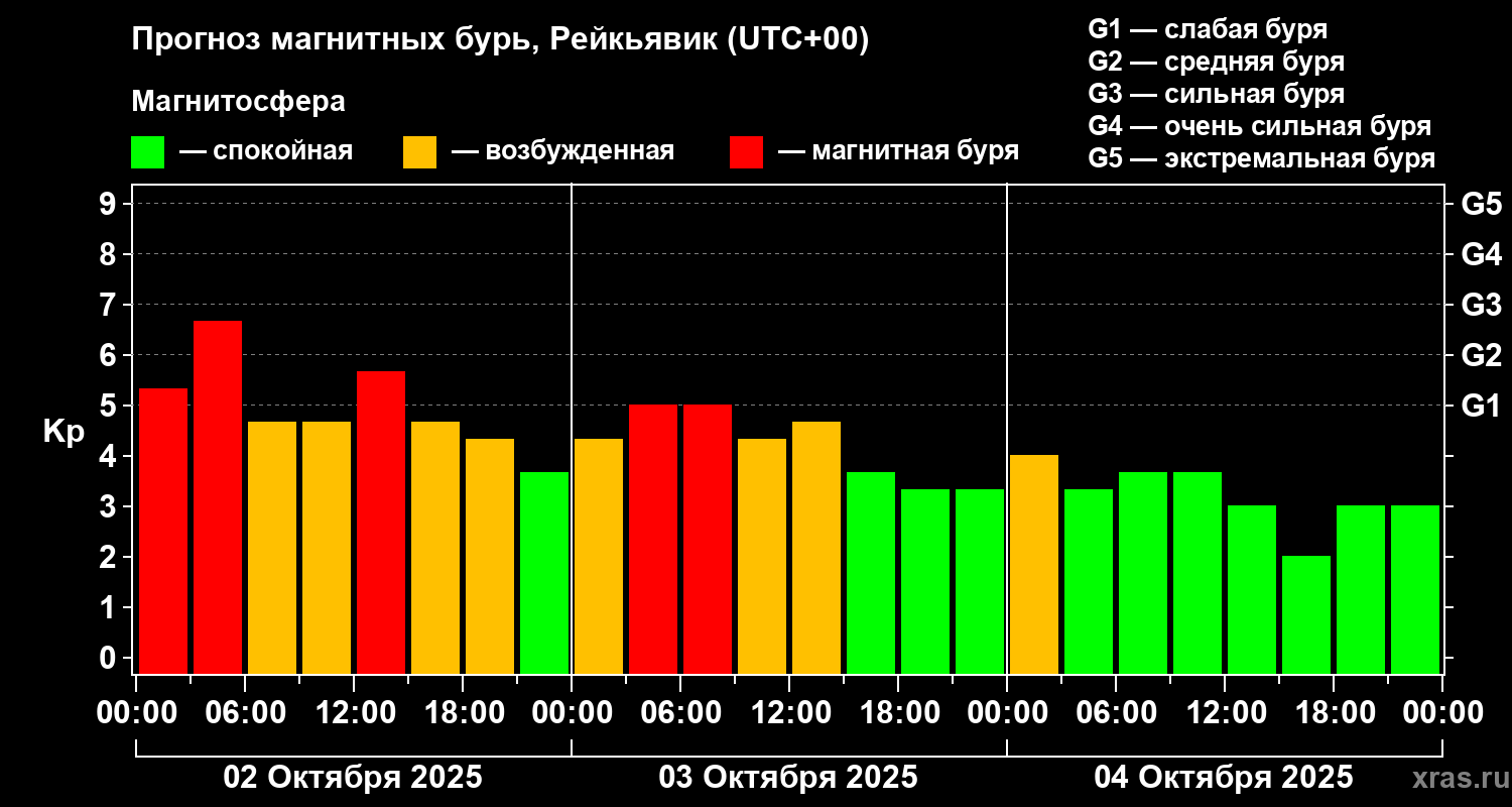 Прогноз магнитных бурь в Рейкьявике — 2 октября 2025 года