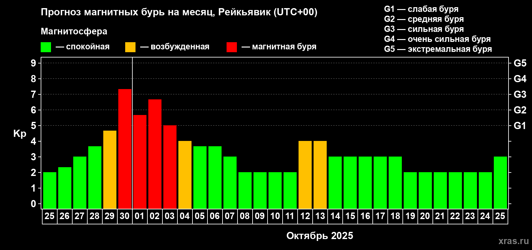 Прогноз магнитных бурь в Рейкьявике — 25 сентября 2025 года