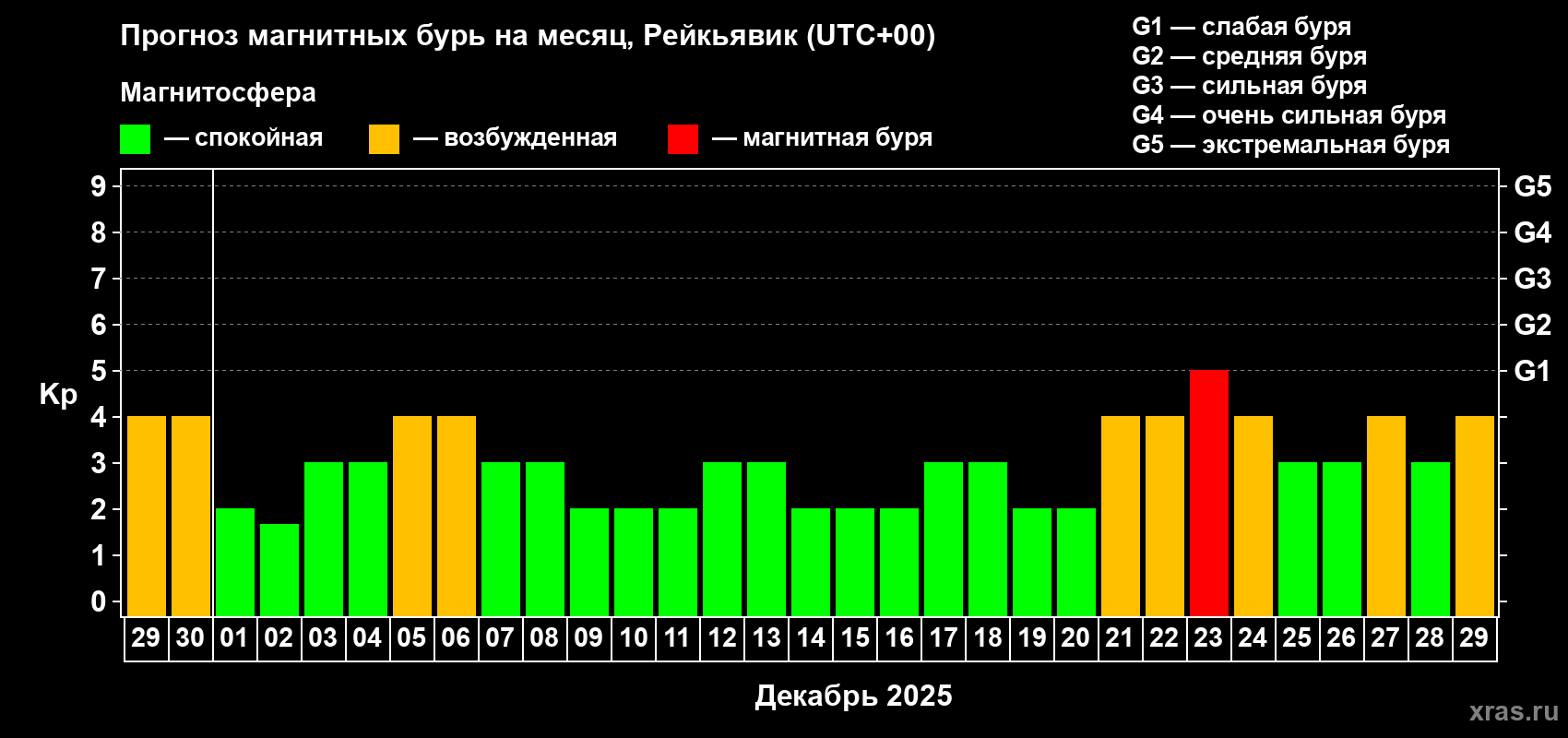 Прогноз магнитных бурь в Рейкьявике — 29 ноября 2025 года