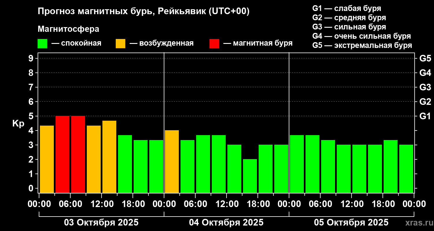 Прогноз магнитных бурь в Рейкьявике — 3 октября 2025 года