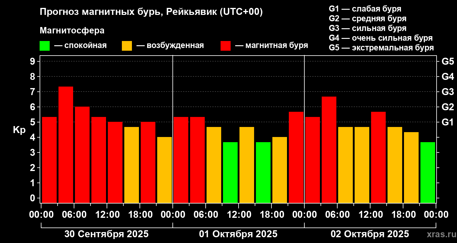 Прогноз магнитных бурь в Рейкьявике на 30 сентября 2025 года