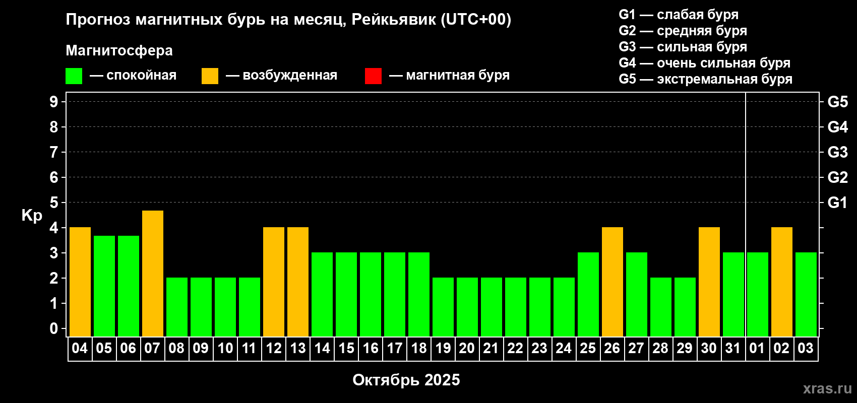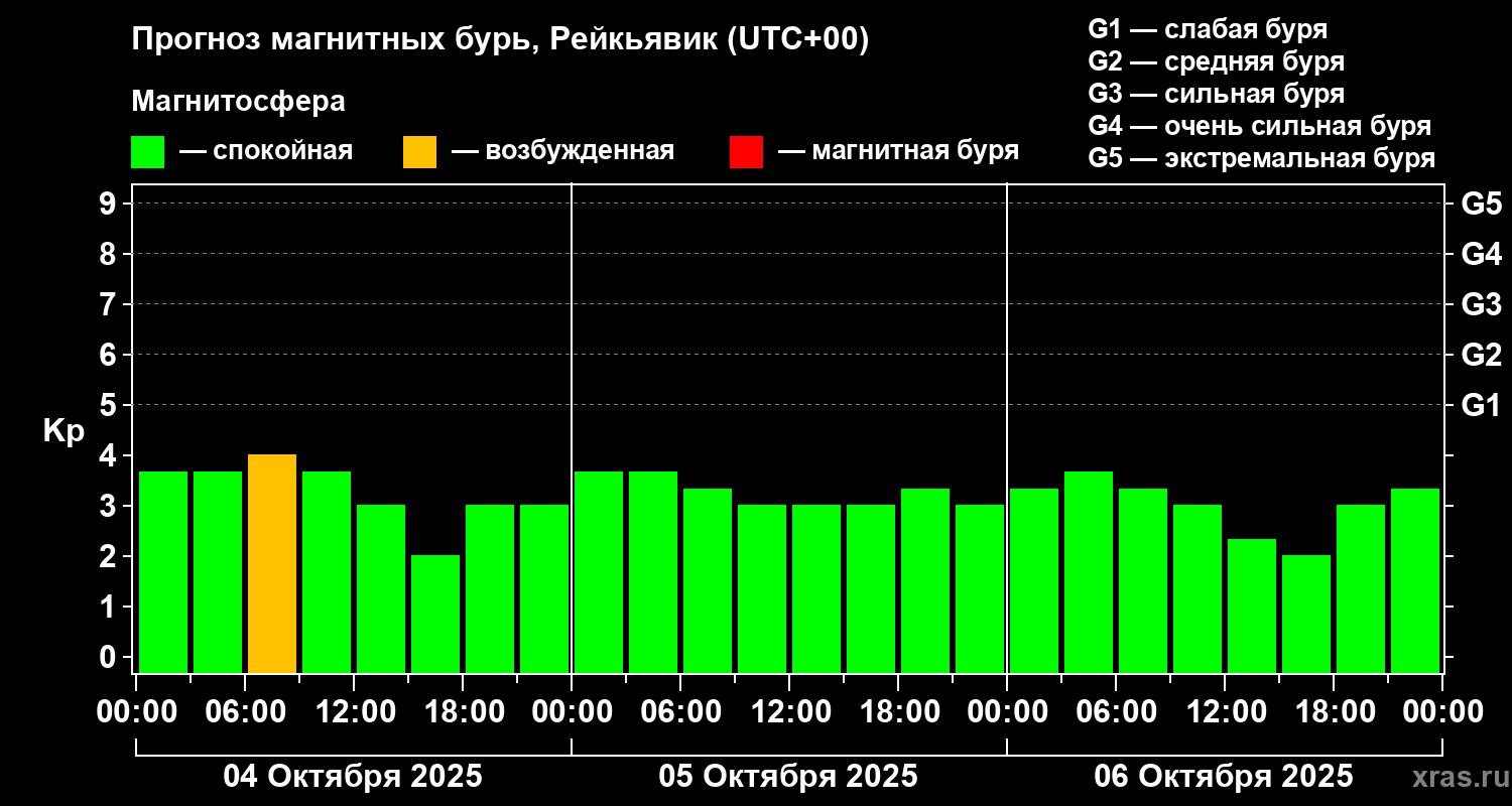 Прогноз магнитных бурь в Рейкьявике — 4 октября 2025 года