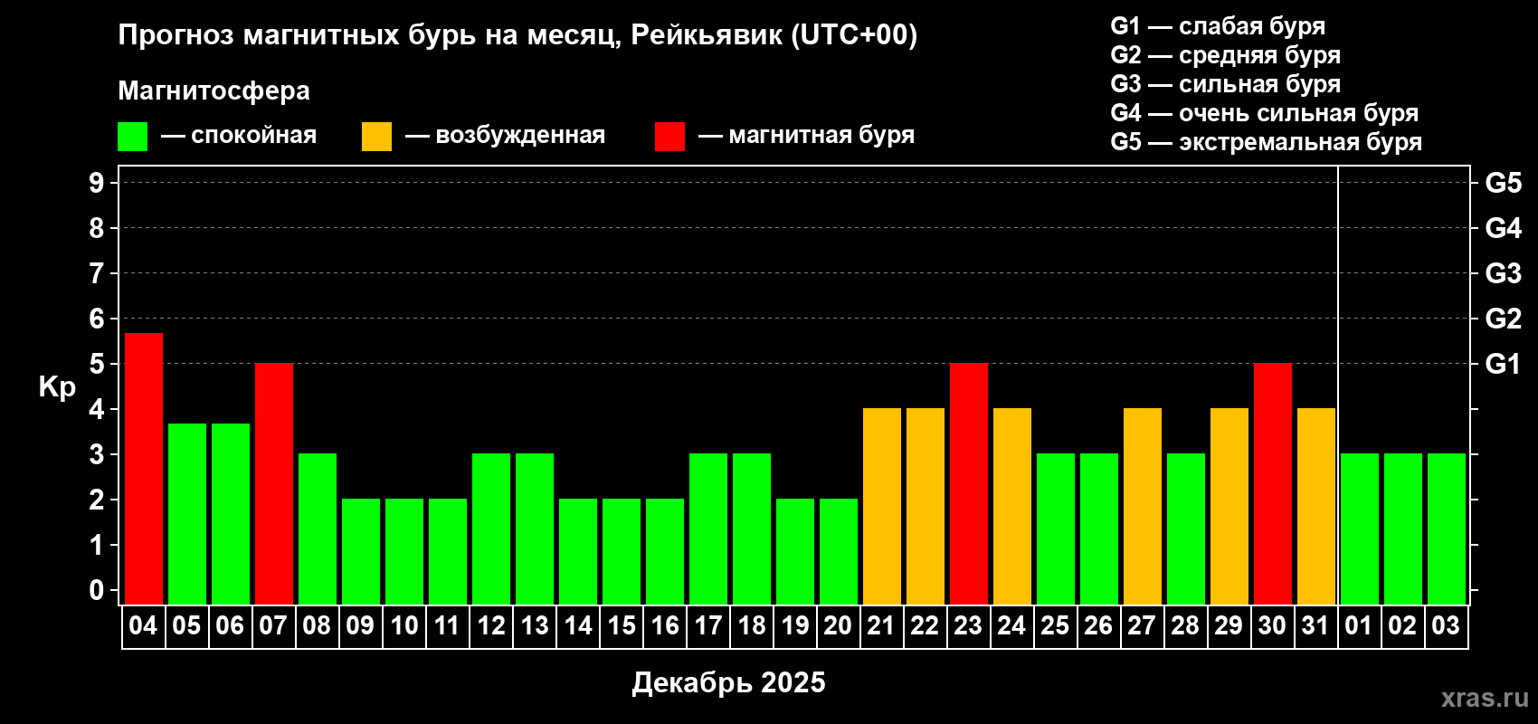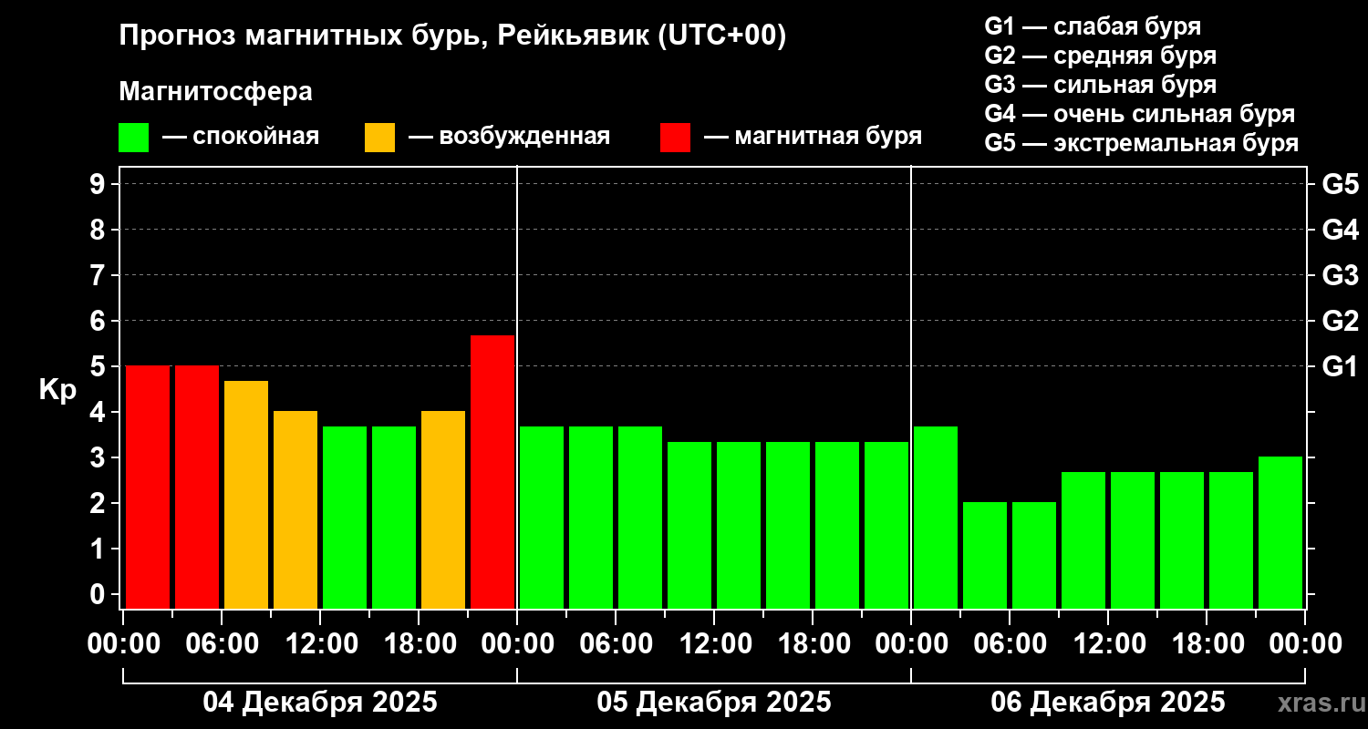 Прогноз магнитных бурь в Рейкьявике — 4 декабря 2025 года
