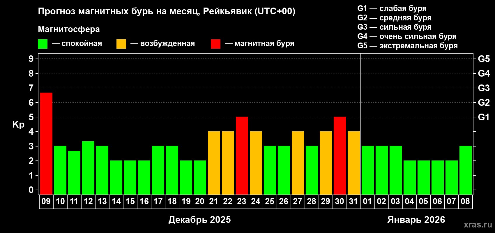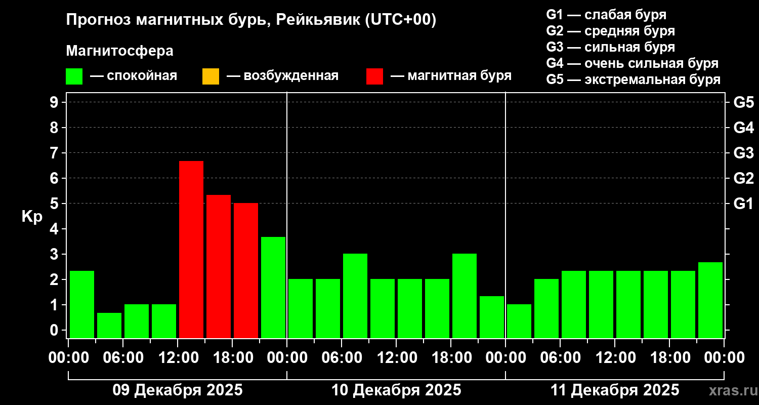 Прогноз магнитных бурь в Рейкьявике на 9 декабря 2025 года