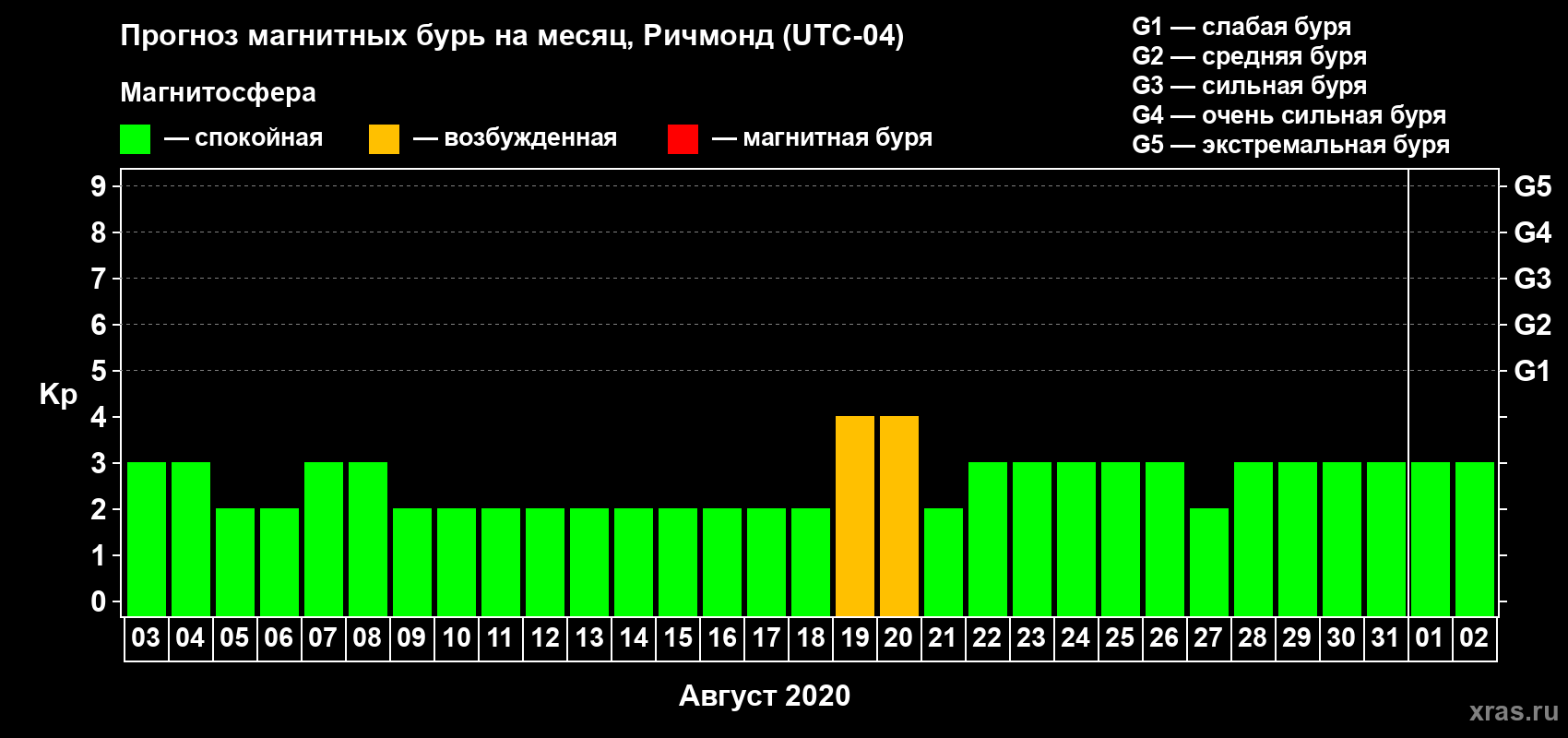 Прогноз магнитных бурь в Ричмонде на 3 августа 2020 года