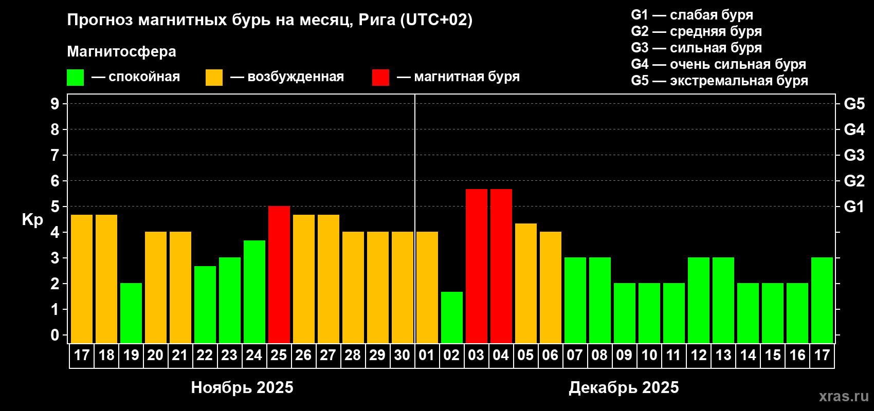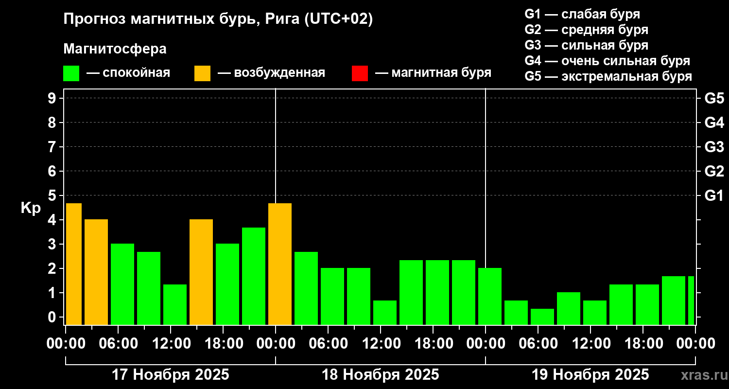 Прогноз магнитных бурь в Риге — 17 ноября 2025 года