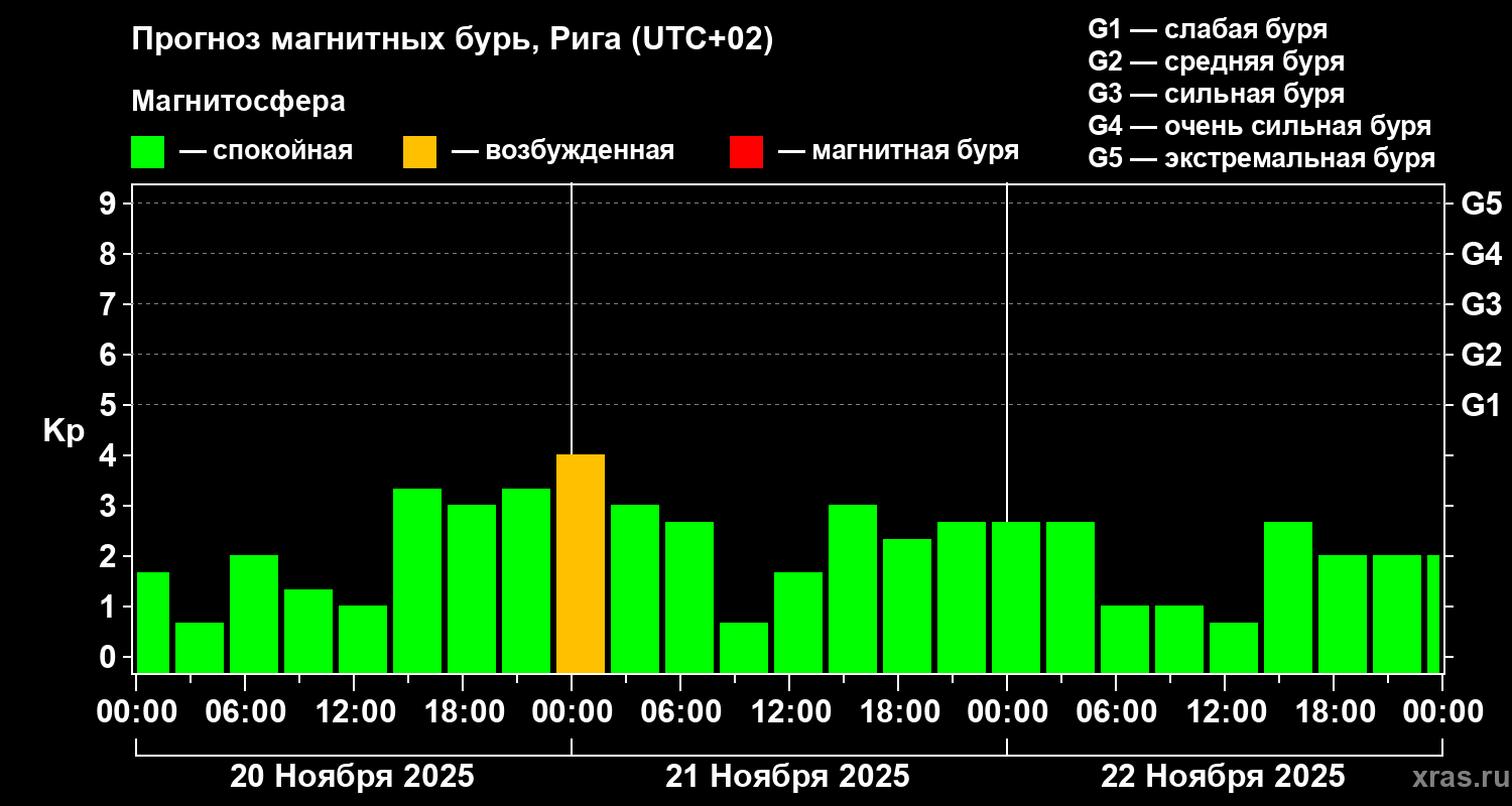 Прогноз магнитных бурь в Риге — 20 ноября 2025 года