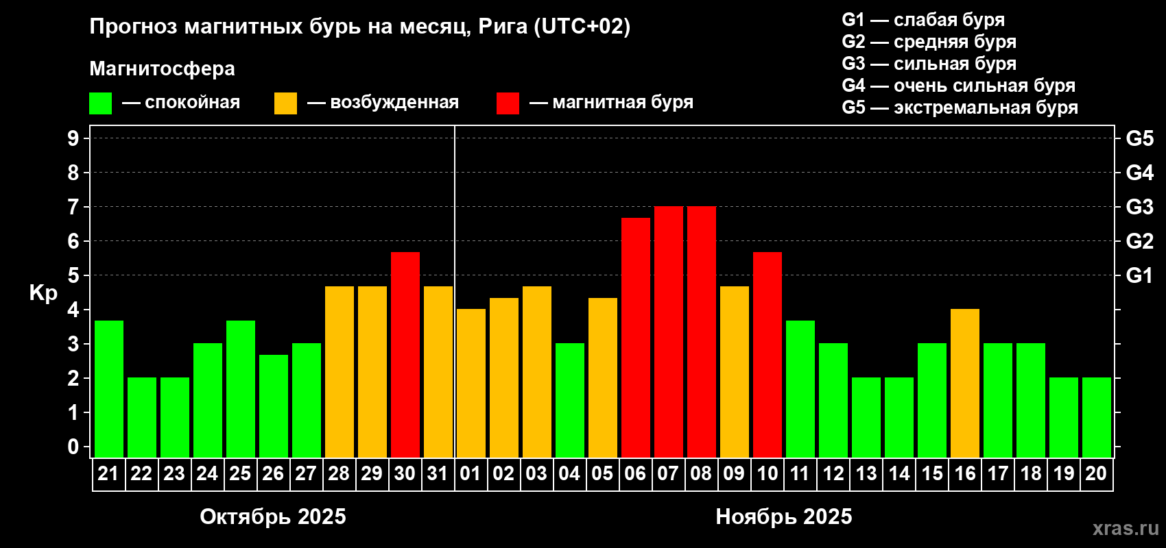 Прогноз магнитных бурь в Риге — 21 октября 2025 года