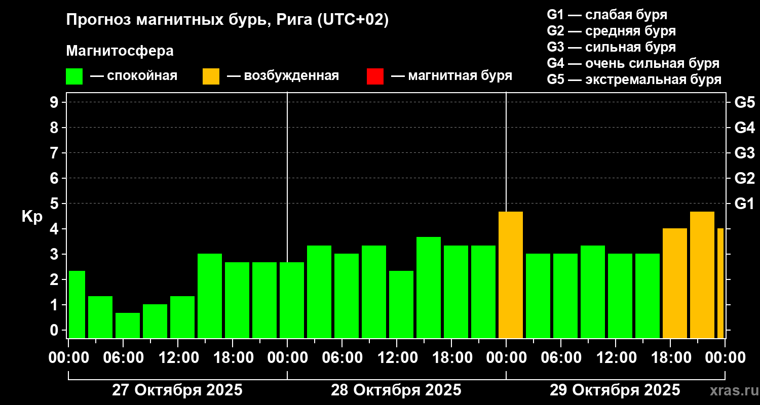 Прогноз магнитных бурь в Риге — 27 октября 2025 года