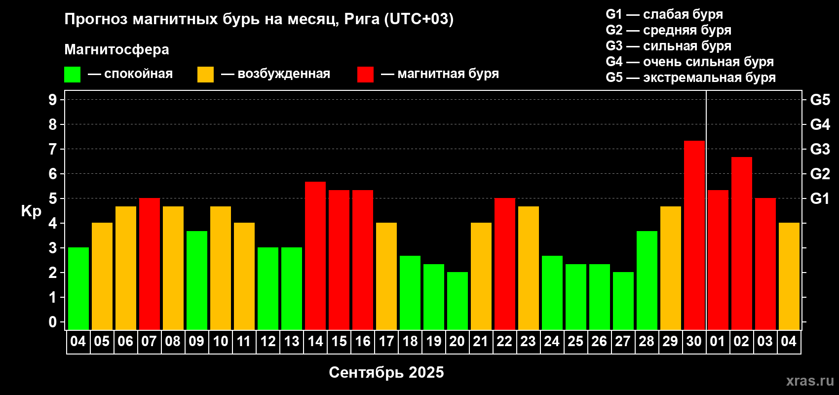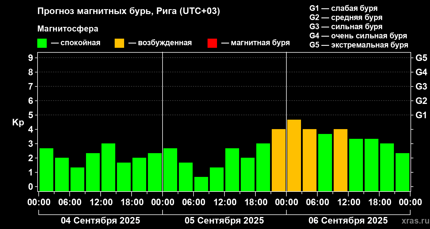 Прогноз магнитных бурь в Риге — 4 сентября 2025 года