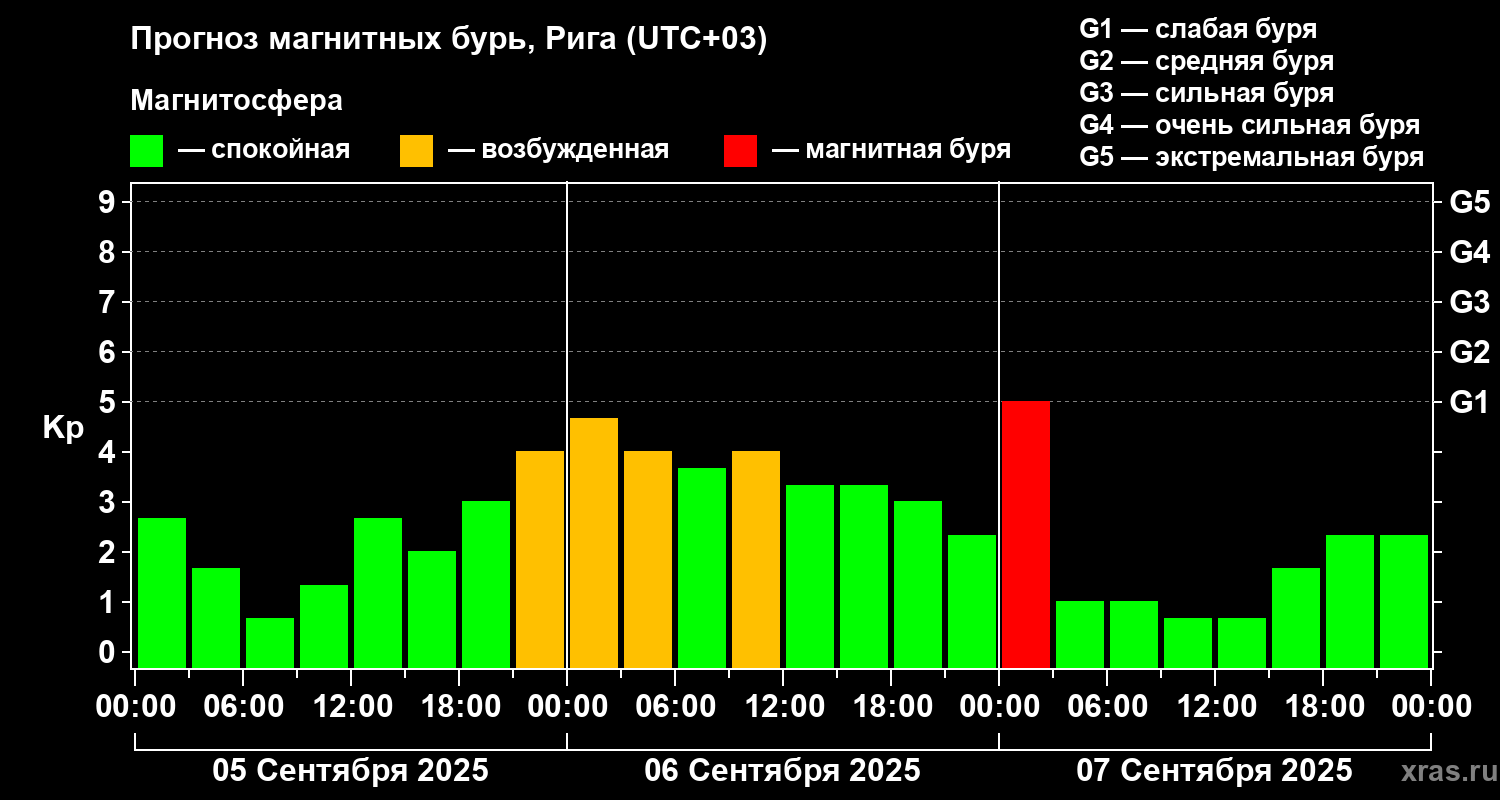 Прогноз магнитных бурь в Риге — 5 сентября 2025 года