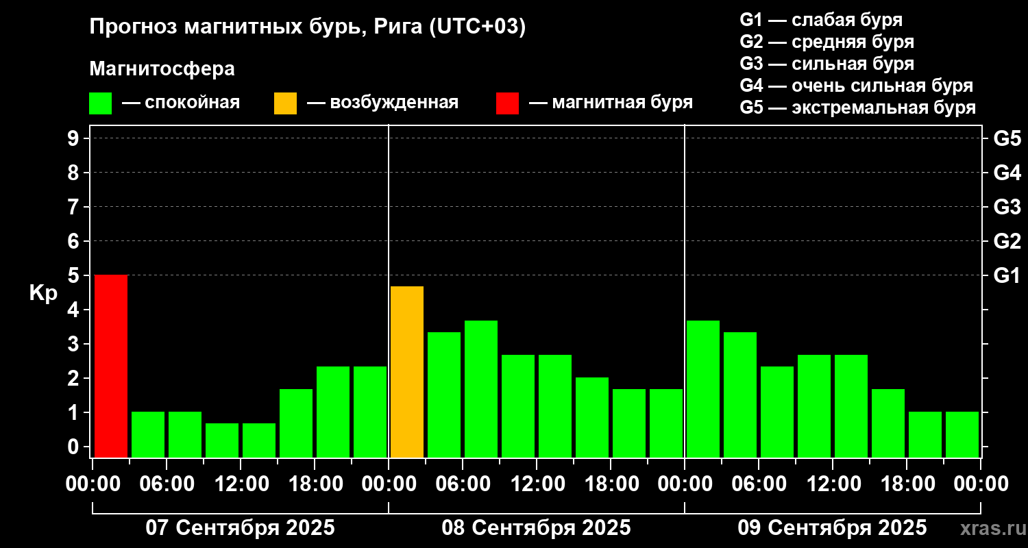 Прогноз магнитных бурь в Риге на 7 сентября 2025 года