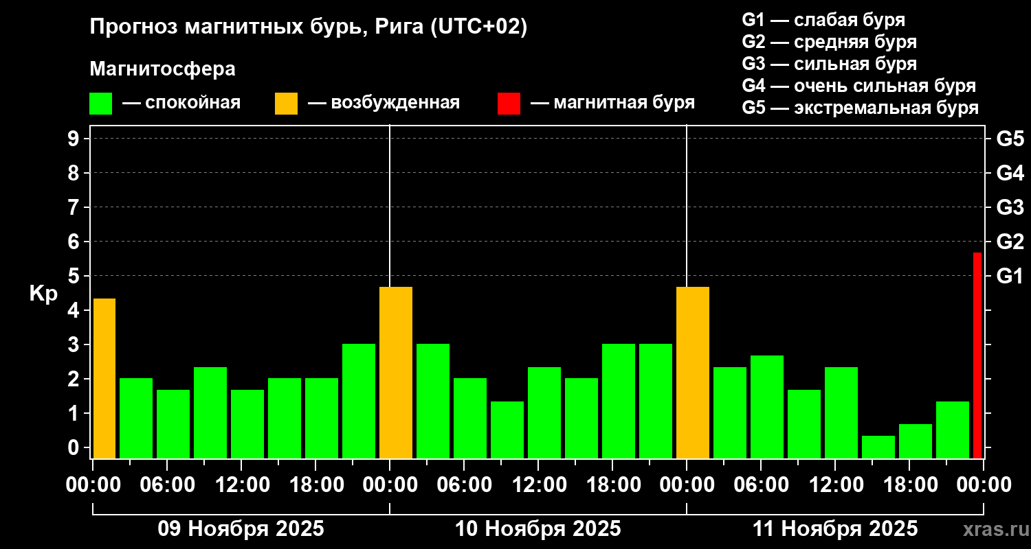 Прогноз магнитных бурь в Риге — 9 ноября 2025 года