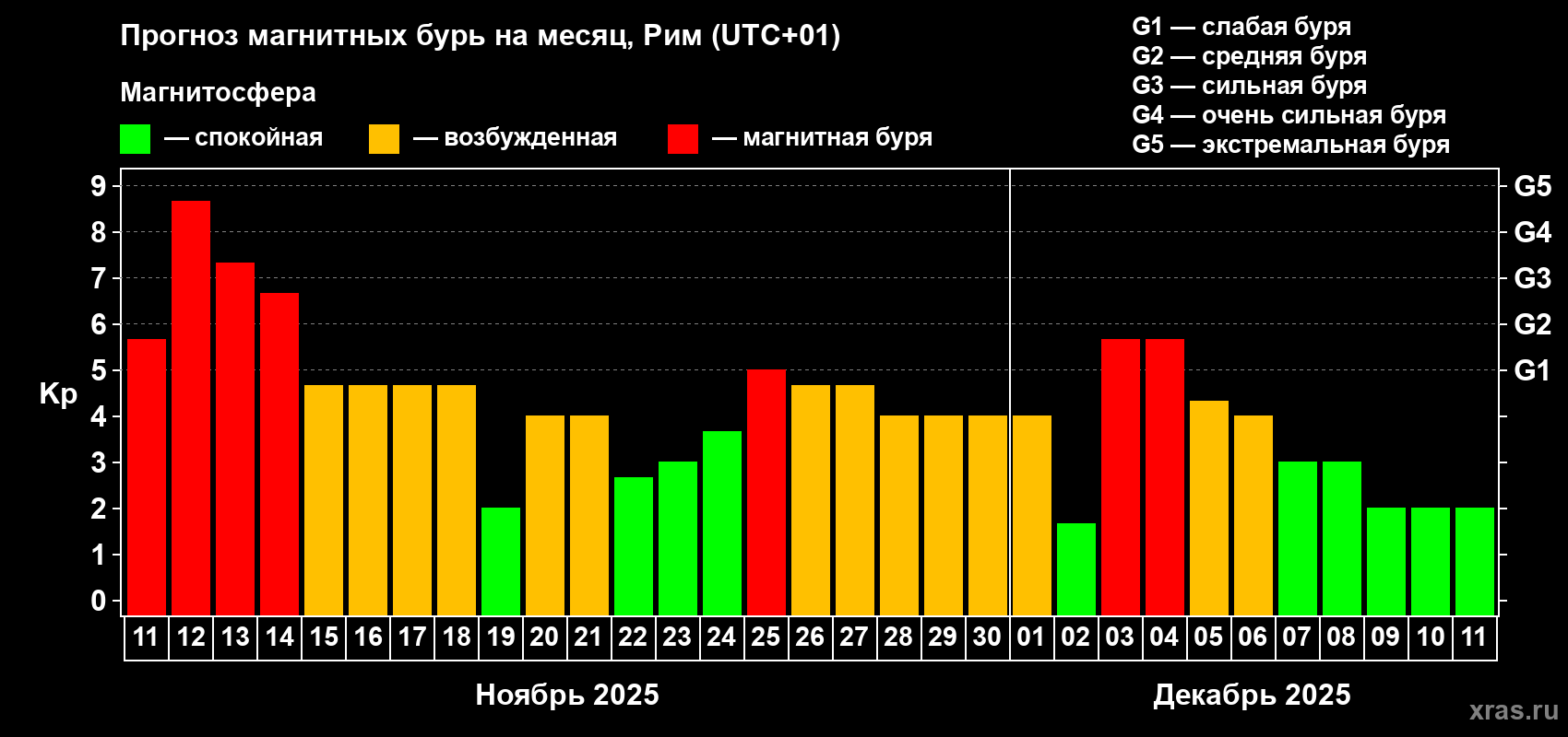 Прогноз магнитных бурь в Риме на 11 ноября 2025 года