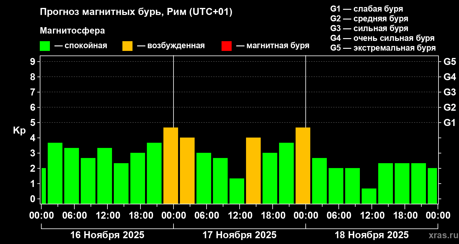 Прогноз магнитных бурь в Риме — 16 ноября 2025 года