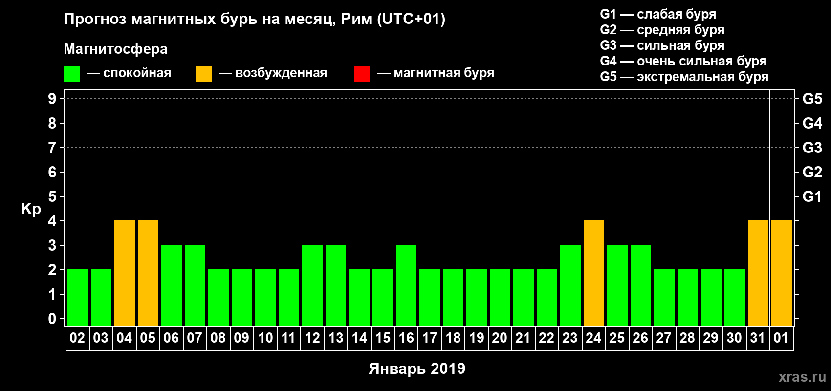 Прогноз максимального суточного геомагнитного индекса Kp на 1 месяц (31 день) с 02 января по 01 февраля 2019 г