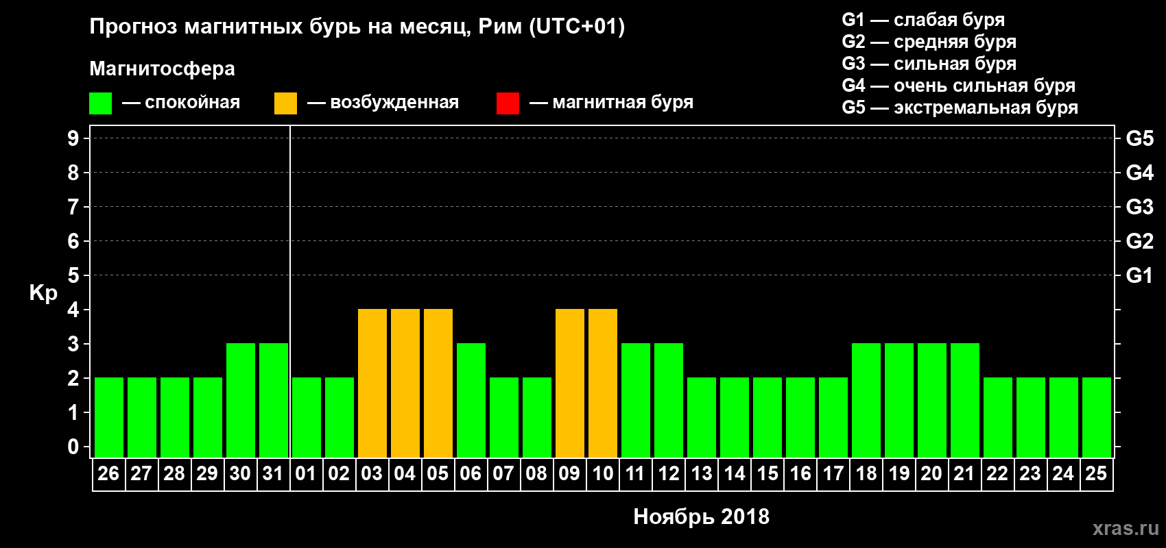 Прогноз максимального суточного геомагнитного индекса Kp на 1 месяц (31 день) с 26 октября по 25 ноября 2018 г