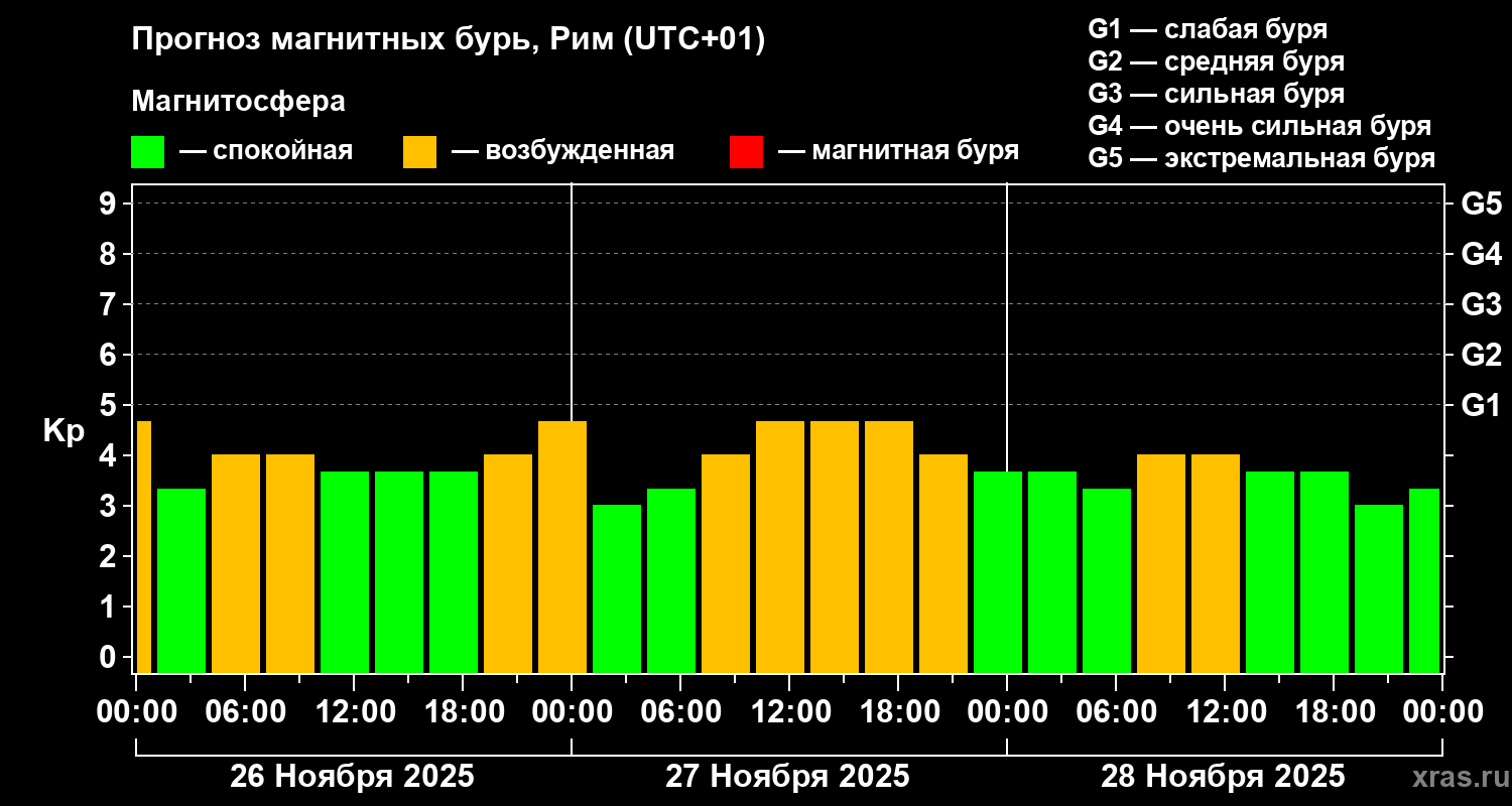 Прогноз магнитных бурь в Риме — 26 ноября 2025 года