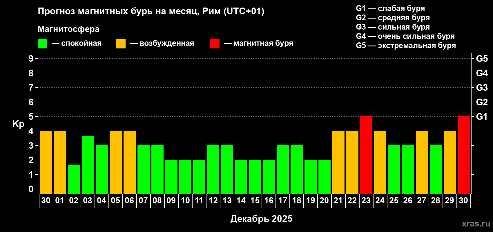 Прогноз магнитных бурь в Риме — 30 ноября 2025 года