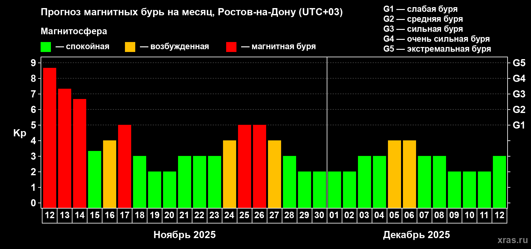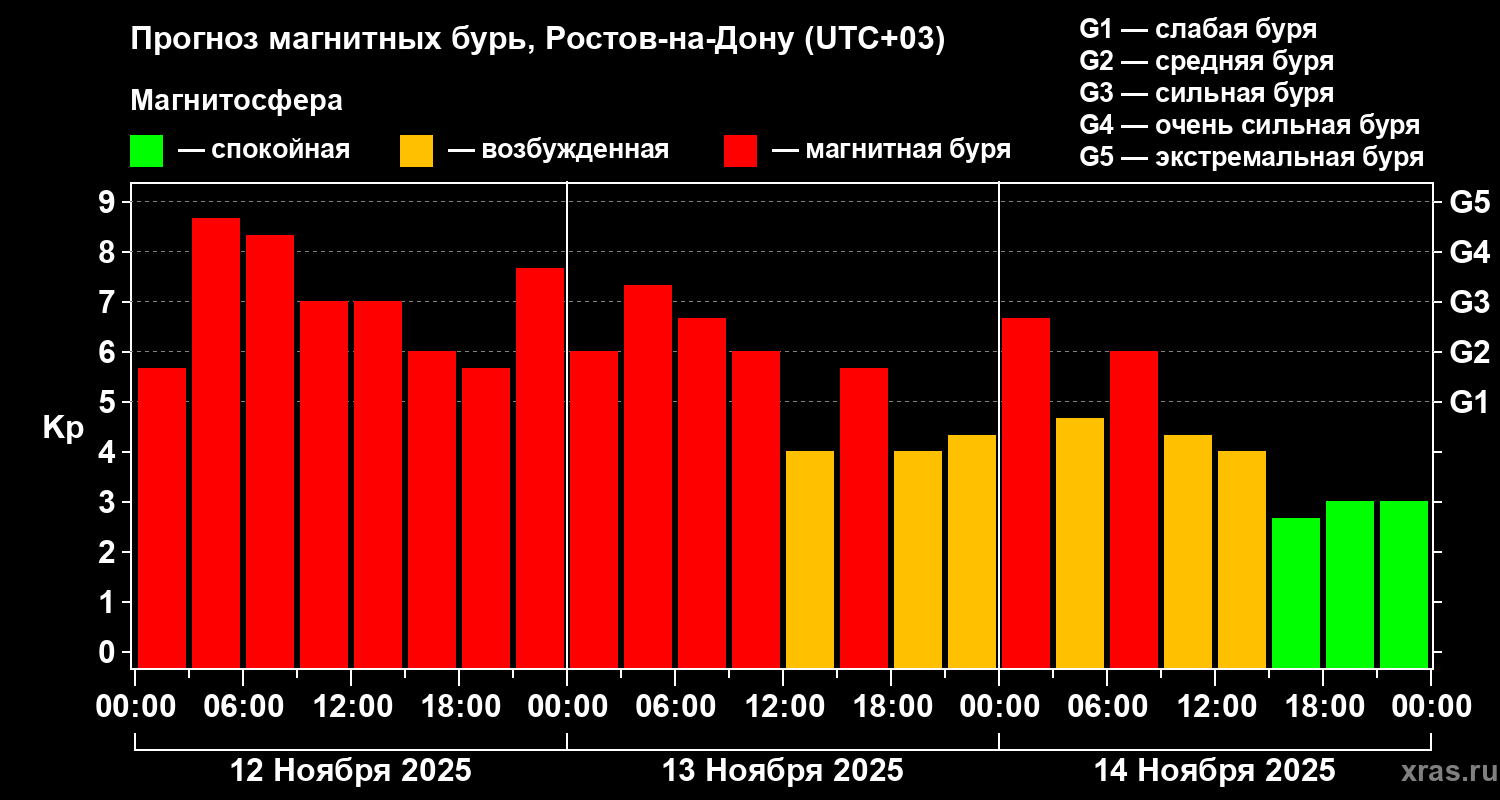Прогноз магнитных бурь Ростове-на-Дону на 12 ноября 2025 года