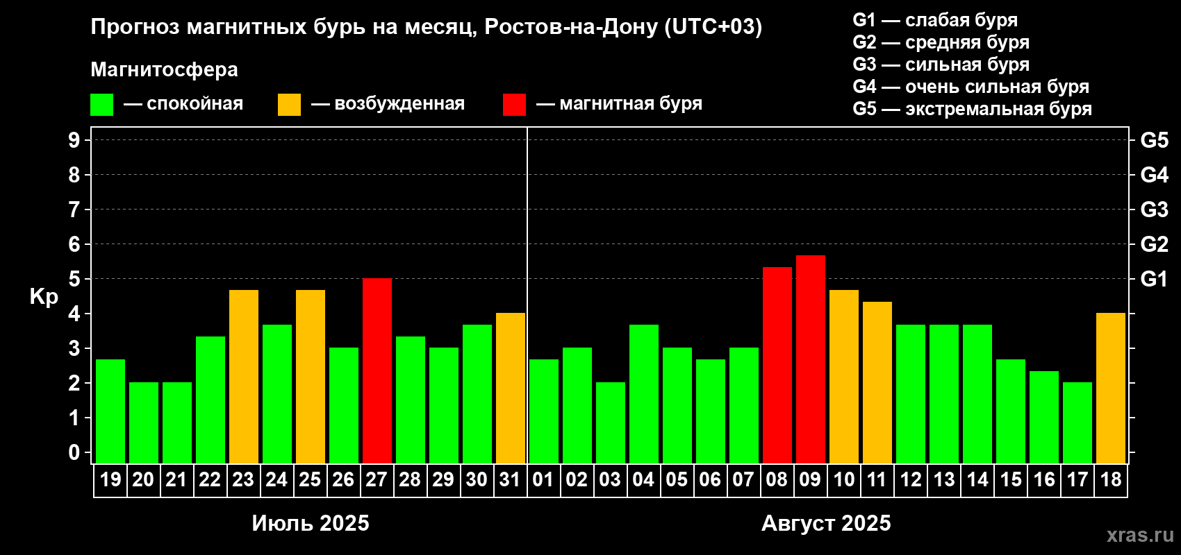 Прогноз магнитных бурь Ростове-на-Дону на 19 июля 2025 года