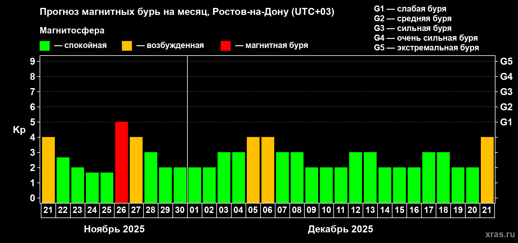 Прогноз магнитных бурь Ростове-на-Дону на 21 ноября 2025 года