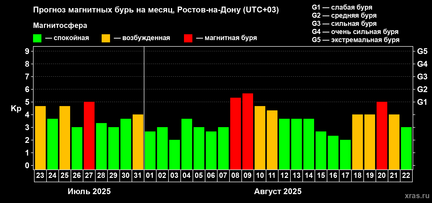 Прогноз магнитных бурь Ростове-на-Дону — 23 июля 2025 года