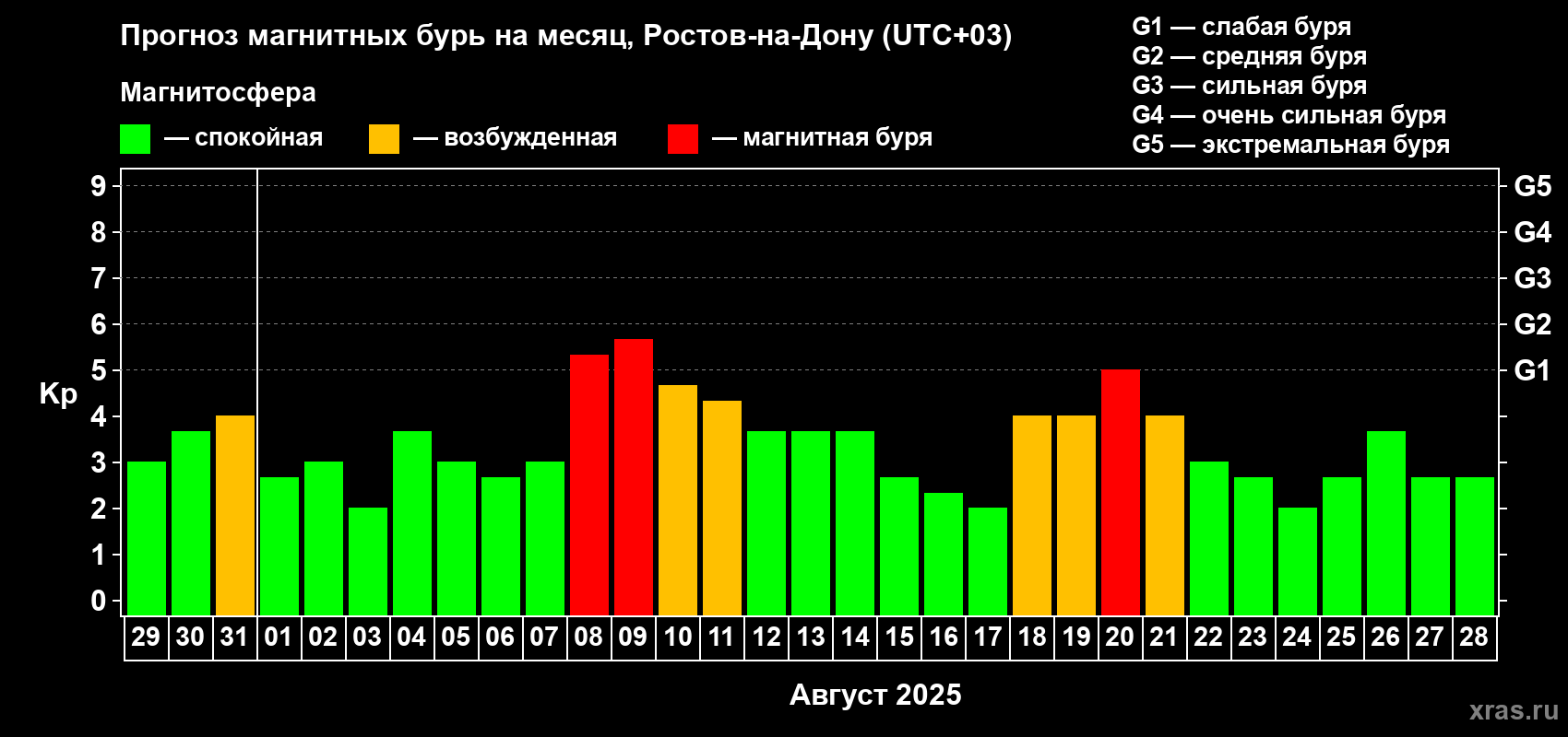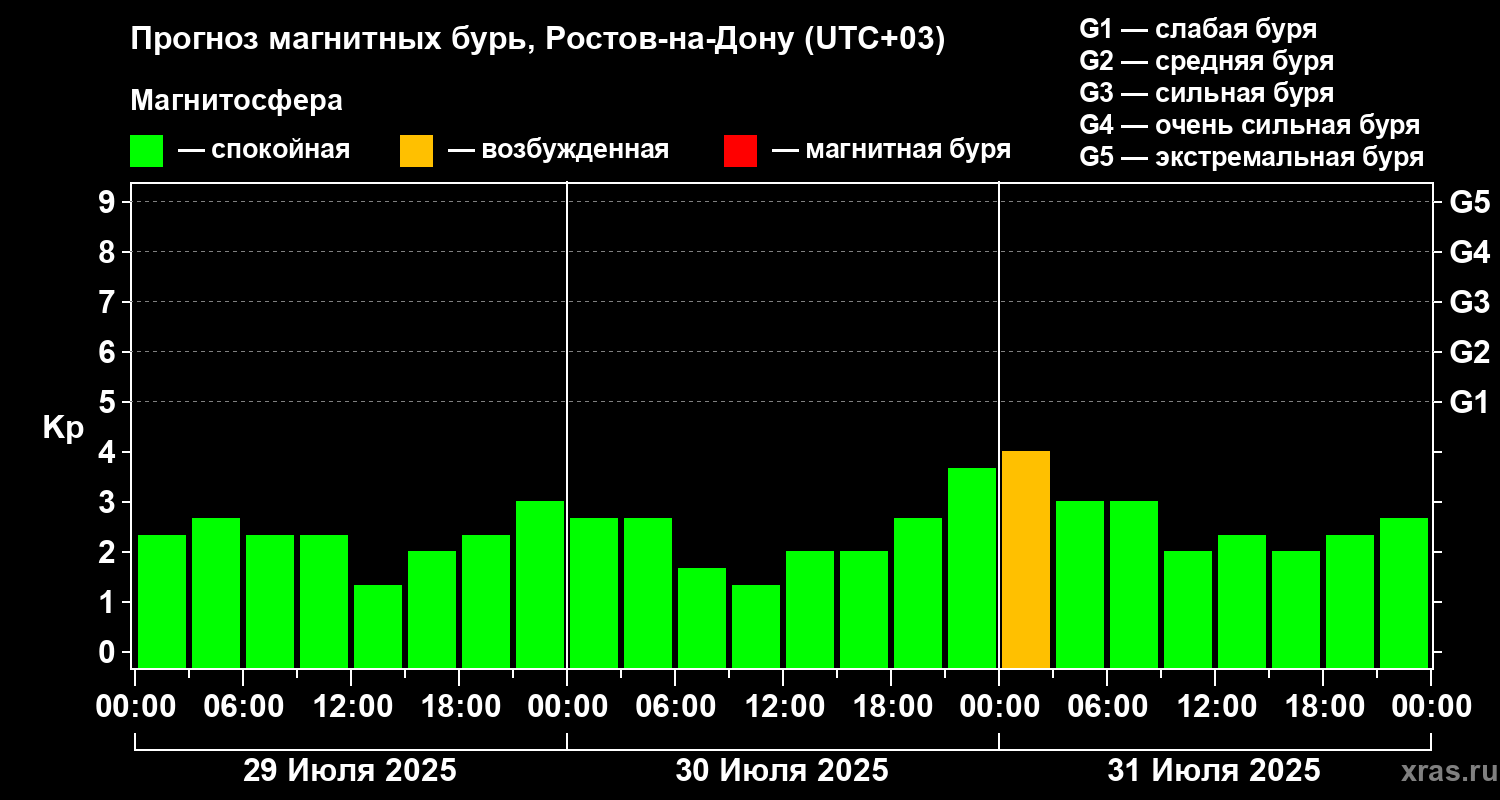 Прогноз магнитных бурь Ростове-на-Дону — 29 июля 2025 года
