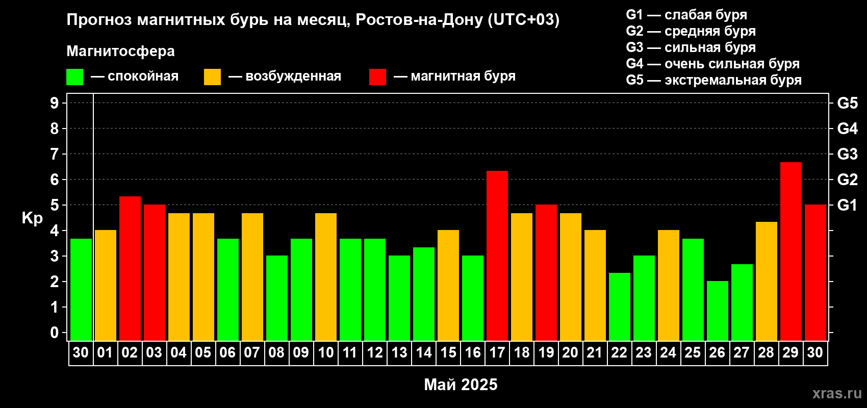 Прогноз магнитных бурь Ростове-на-Дону — 30 апреля 2025 года