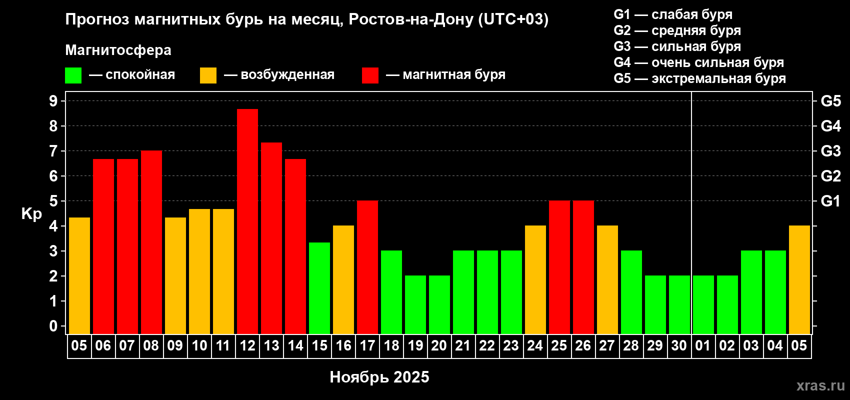 Прогноз магнитных бурь Ростове-на-Дону на 5 ноября 2025 года