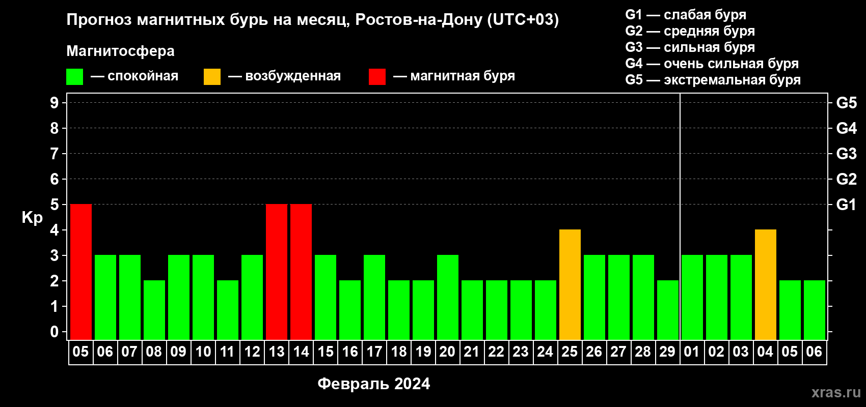 Прогноз магнитных бурь Ростове-на-Дону — 5 февраля 2024 года
