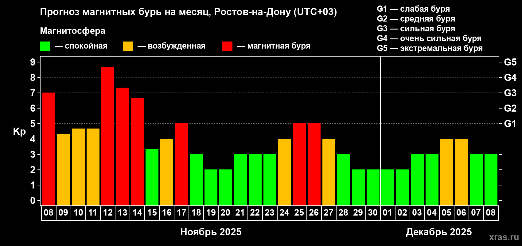 Прогноз магнитных бурь Ростове-на-Дону на 8 ноября 2025 года