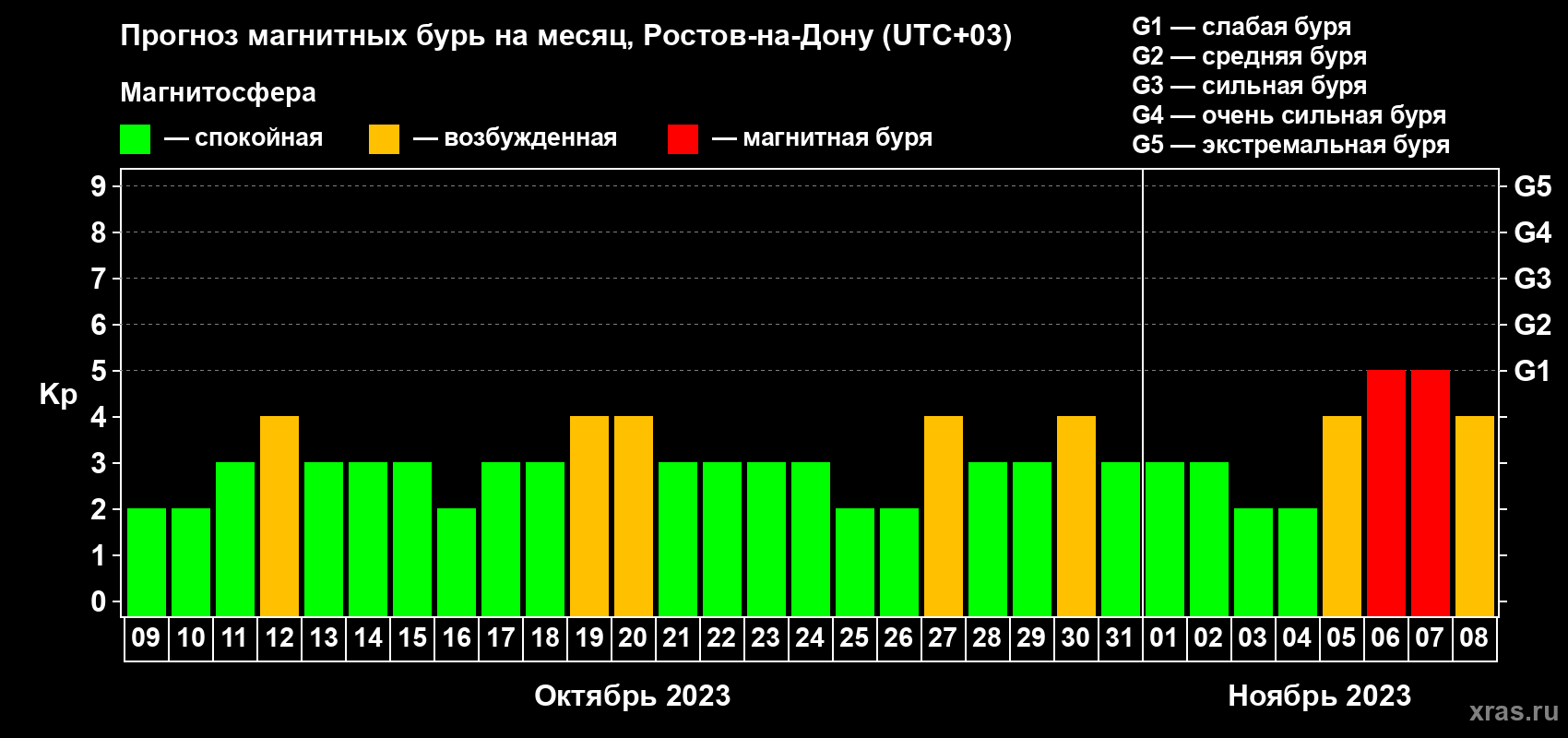Прогноз магнитных бурь Ростове-на-Дону на 9 октября 2023 года
