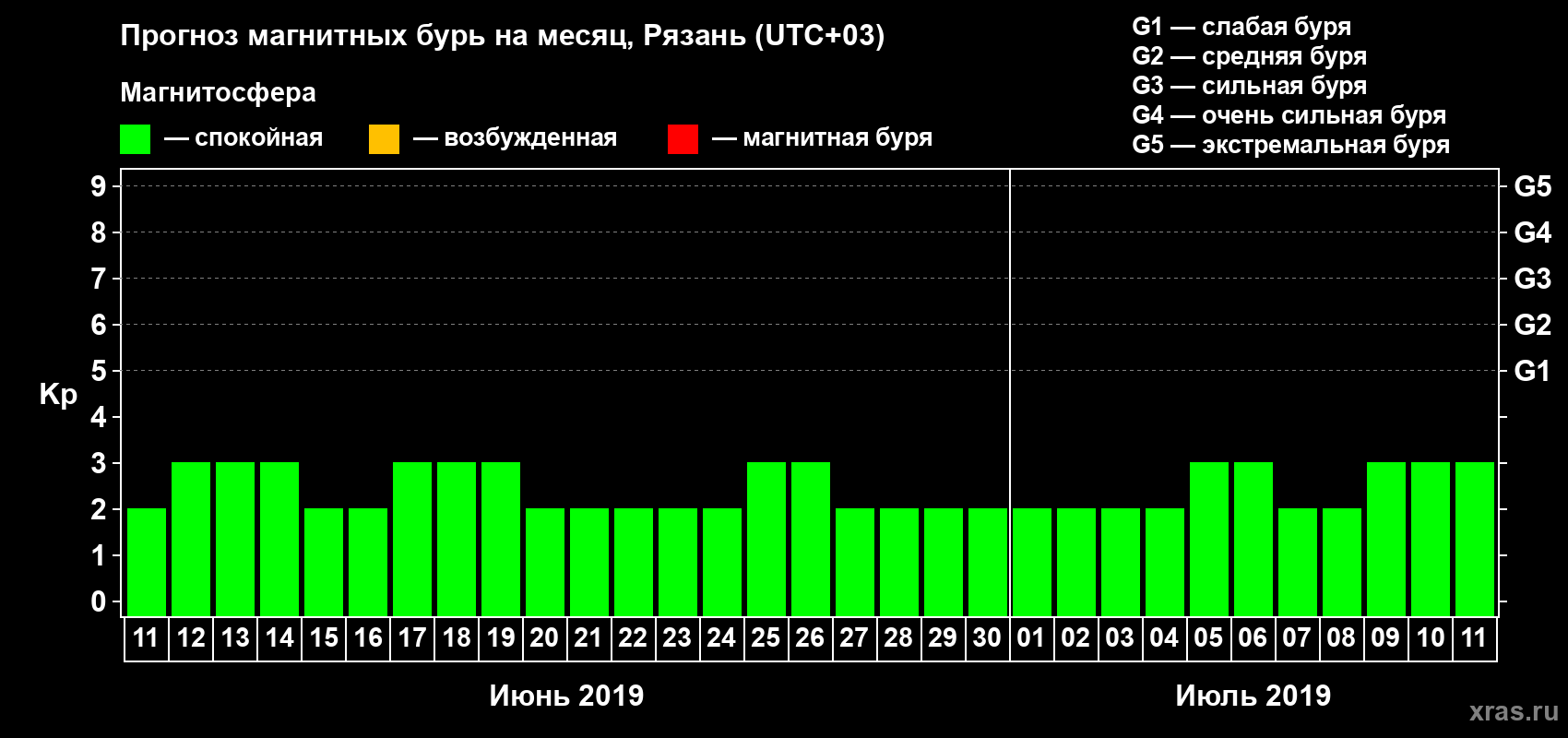 Прогноз магнитных бурь Рязани на 11 июня 2019 года