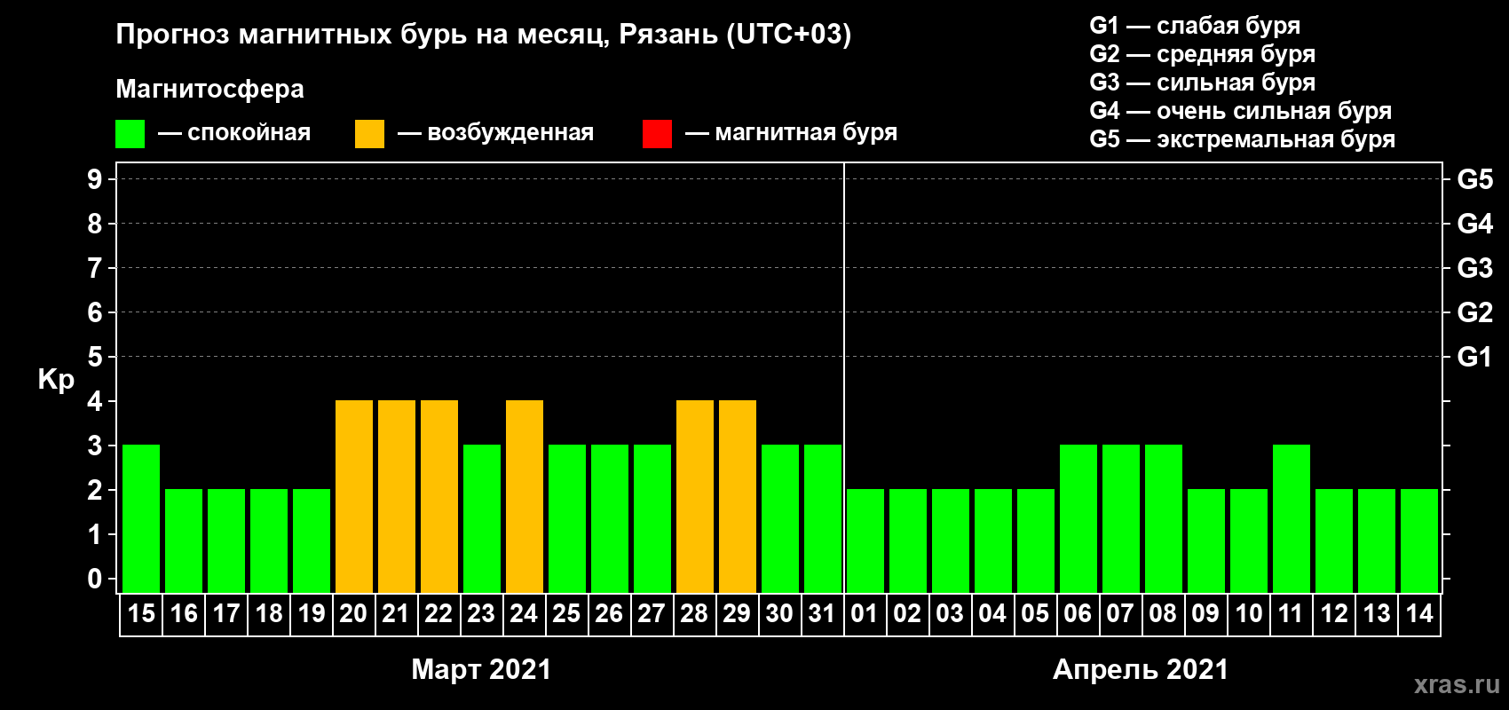 Прогноз магнитных бурь Рязани на 15 марта 2021 года