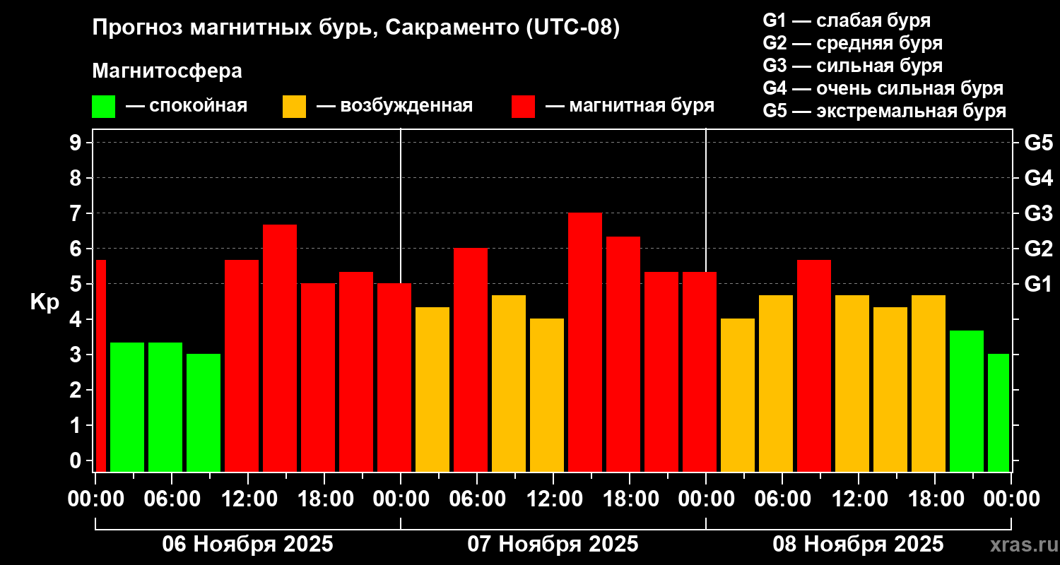 Прогноз магнитных бурь Сакраменто — 6 ноября 2025 года