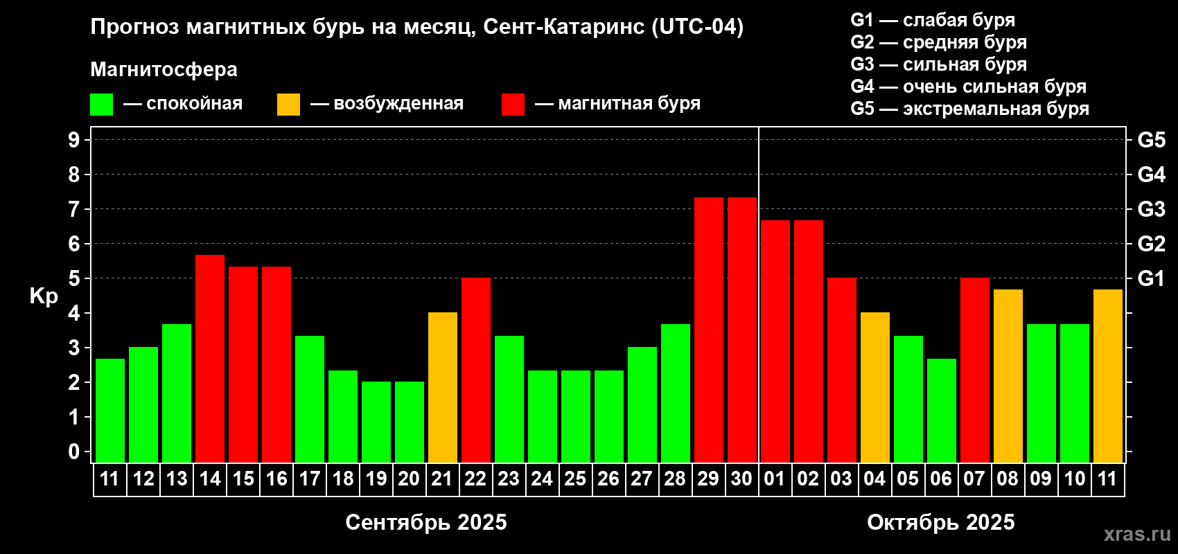 Прогноз магнитных бурь в Сент-Катаринсе — 11 сентября 2025 года