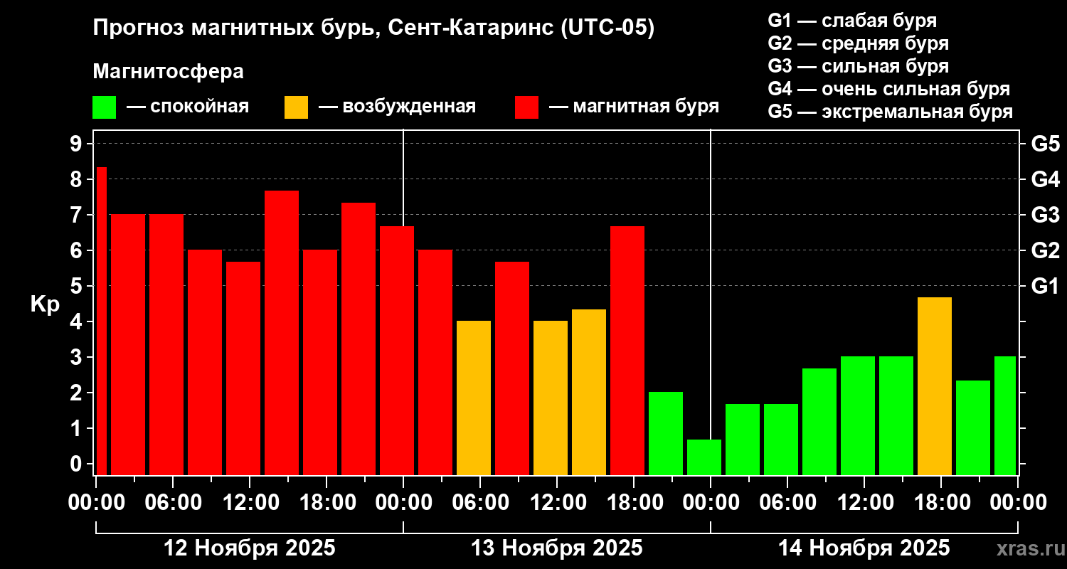Прогноз магнитных бурь в Сент-Катаринсе — 12 ноября 2025 года