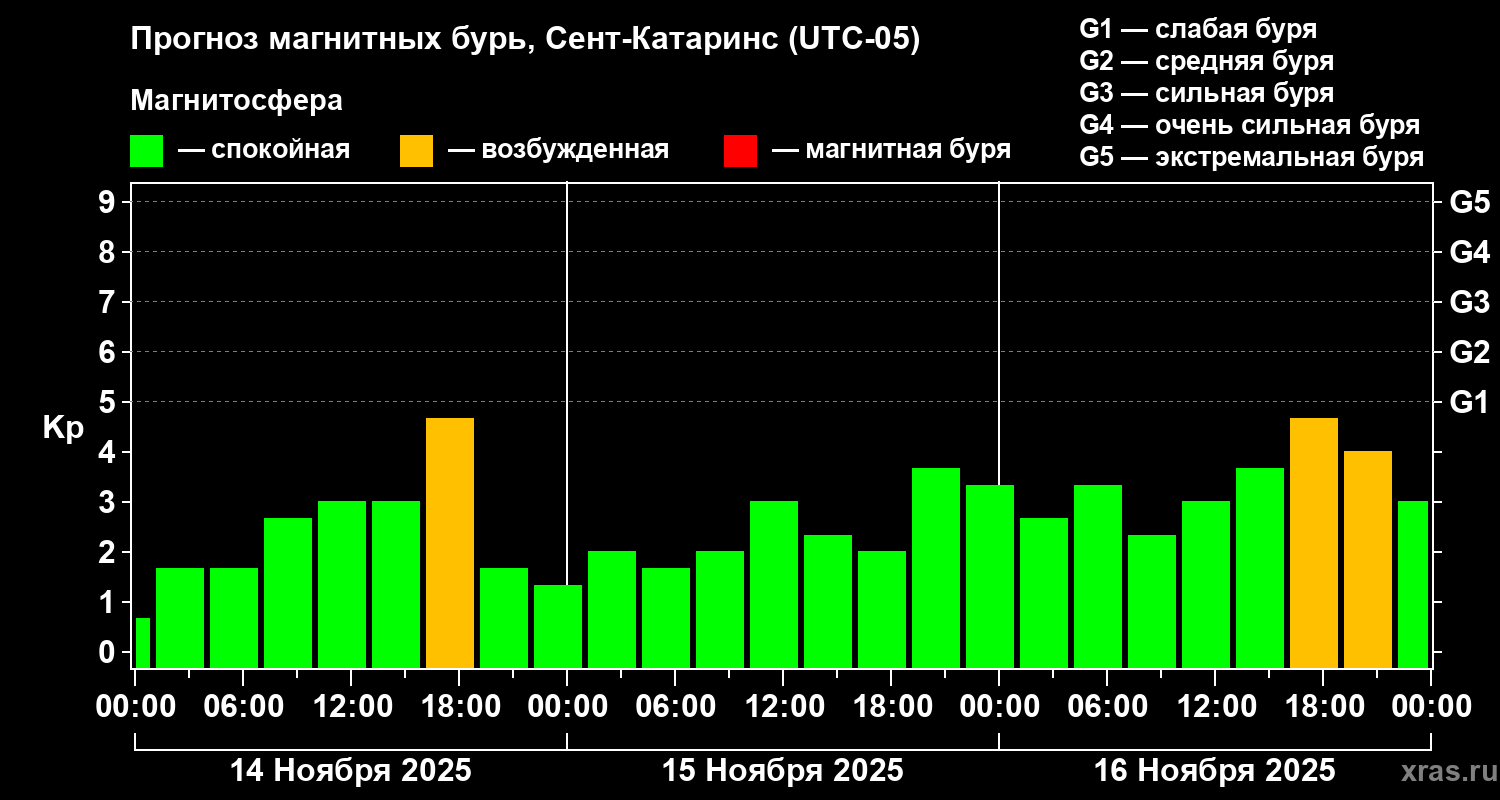 Прогноз магнитных бурь в Сент-Катаринсе на 14 ноября 2025 года