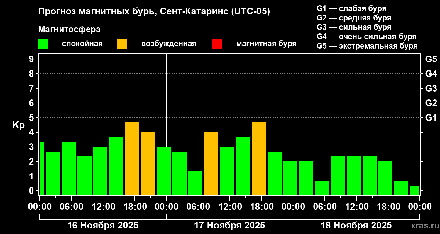 Прогноз магнитных бурь в Сент-Катаринсе — 16 ноября 2025 года