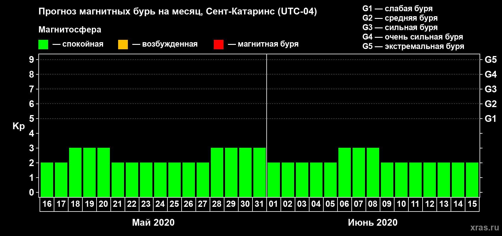 Прогноз магнитных бурь в Сент-Катаринсе — 16 мая 2020 года