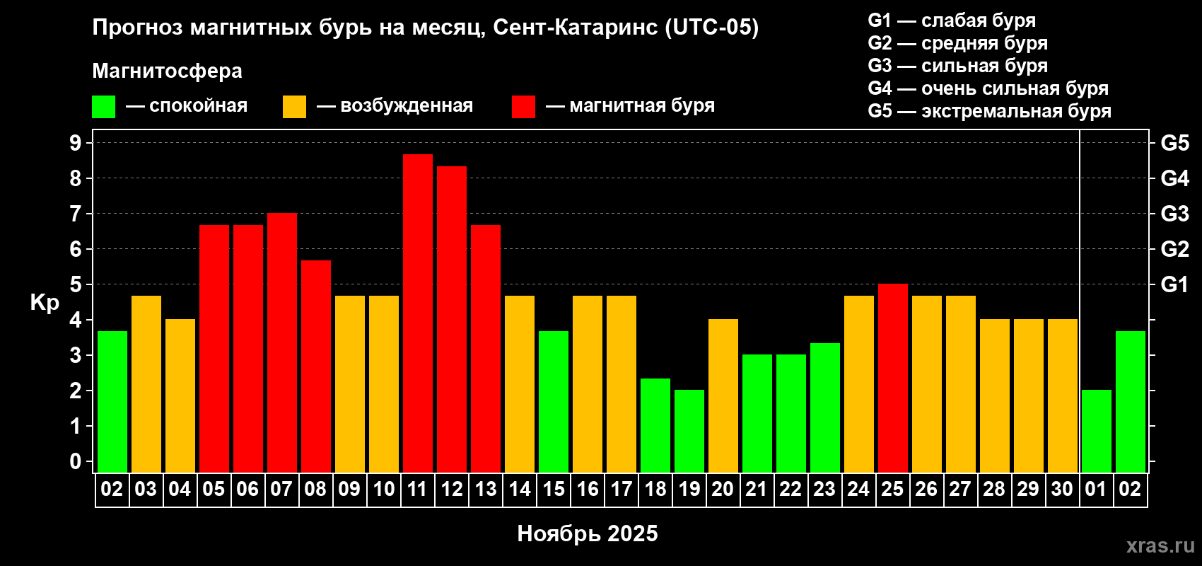 Прогноз магнитных бурь в Сент-Катаринсе — 2 ноября 2025 года